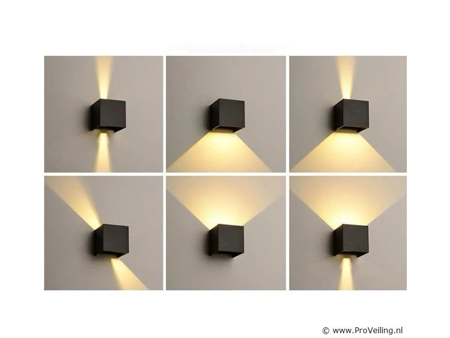 6 x Tweerichtings LED wandlamp – MBDèle: SW-2312-2 – Vorm: kubus – Vermogen: 2 x 5W – Lichtstroom: 900 lm – Kleurtemperatuur: 3500K (neutraal wit) – IRC: 75 – Beamingshoek: 120° – Hoogwaardig aluminium – Kleur: zwart – Waterdicht: IP54 – Beschermd tegen stofEn spatwater – Compacte afmetingen – COB LED-technologie – Instelbaar – Levensduur: 30.000 uur – Spanning: 85-265V (50/60Hz) – Inclusief lichtbron – Geschikt voor binnen en buiten.
