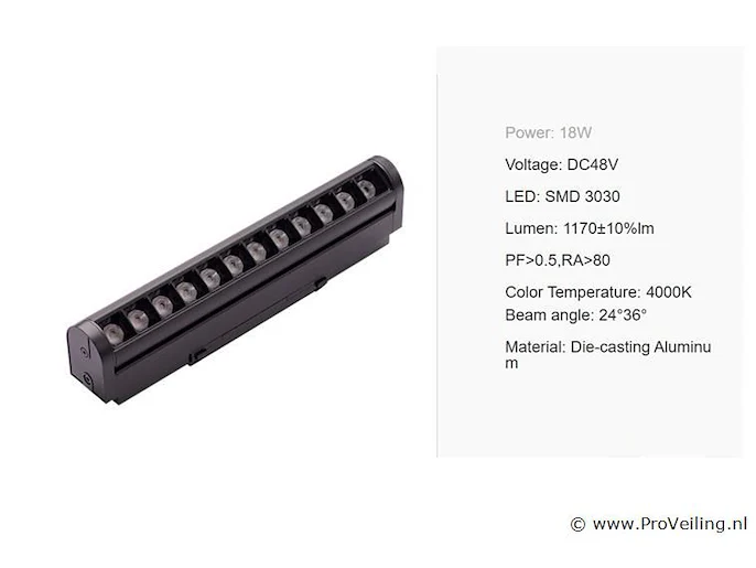5 x Alfa LED-spot op magnetische rail 48V - 18W - Zwart - LED-spot op magnetische rail 48V - 18W - Kleurtemperatuur: 4.000 K (neutraal wit) - Model: Alfa - VermogenLicht: 1.800 lumen - LED-type: SMD Osram - Spanning: 48VDC - niet inclusief transformator - Levensduur: 30.000 uur - 180° oriëntatiehoek - IP20 - Geschikt voor gebruik binnenshuis - IRC (AR): 90 - Ideaal voor ruimtesSidentiels, Winkels en etalages, Kantoren, Hotels en restaurants - Afmetingen: 342 x 75 x 32 mm - Hoogwaardig aluminium - Inclusief montagemateriaal - Inclusief lichtbron