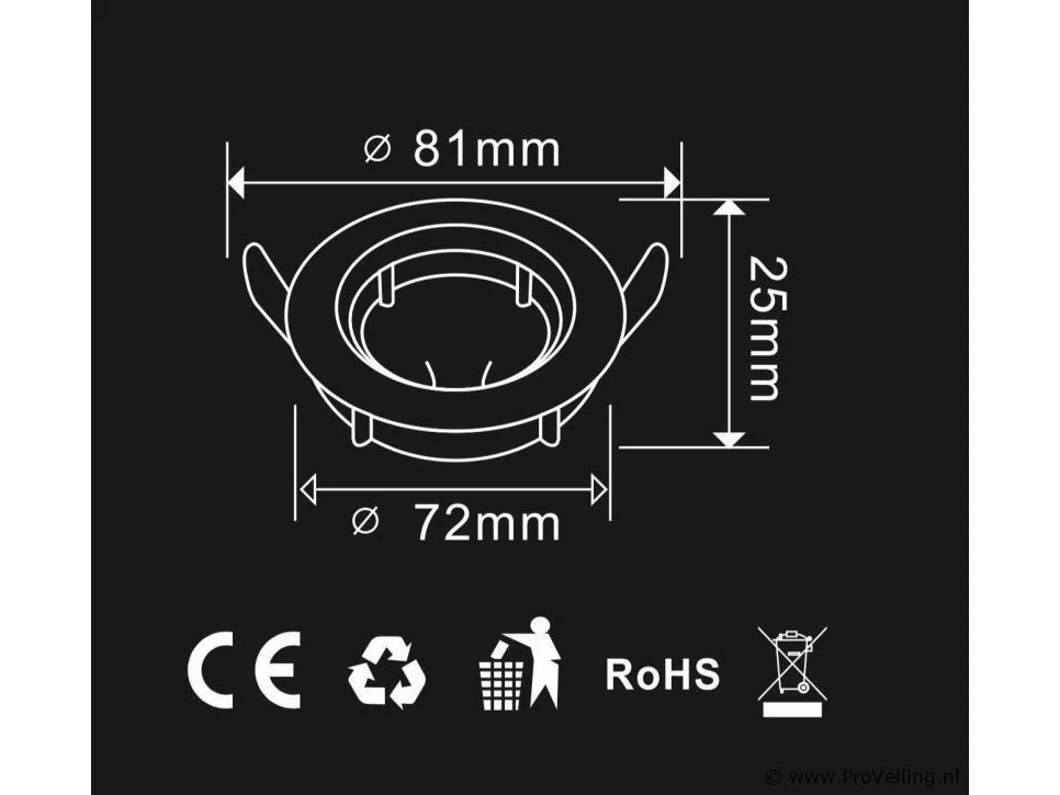 50 x Inbouwarmatuur GU10 met lamphouder – Geïntegreerd model – Ronde vorm – Kleur: Zilver Verchroomd – Gemaakt van hoogwaardig aluminium – Afmetingen: Ø 80 x 25 mm – Inbouwdiameter: Ø 70 mm – Draaibaar op ±45° voor een flitsFlexibele straal – Beamhoek: 120° – GU10 fitting inbegrepen – Compatibel met alle GU10 en MR16 spots (LED of halogeen) – Beschermingsgraad: IP20 (binnengebruik) – Lampen niet inbegrepen.