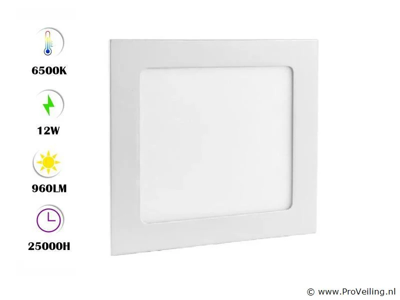 20 x Vierkant inbouw LED-paneel – Vermogen 12W – LED-type: SMD – Kleurtemperatuur 6500K (bKoude lanc) – Lichtstroom: 960 lumen – Afmetingen: 170 x 28 mm – Montageuitsparing: 140 mm – Beamingshoek: 40° – Spanning: 220-240V – IP20 – Levensduur: 30.000 uur – Driver inbegrepen – Ideaal voor kantoren, winkels, keukens en interieurs nMet een intens en homogeen licht.