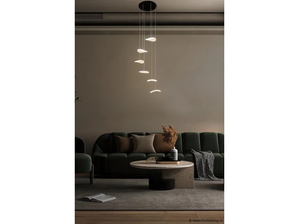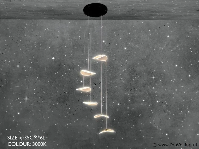 LED hanglamp model B060/6 – Kleurtemperatuur 3000K (warm wit) – Diameter: 350 mm – In hoogte instelbaarE – Lichtbron: geïntegreerde LED-strip – Spanning: 220-240V (50/60 Hz) – Inclusief montageset – Ontworpen voor moderne en stijlvolle binnenverlichting – Ideaal voor woonkamer, eetkamer, slaapkamer of kantoor – 3 jaar garantie.