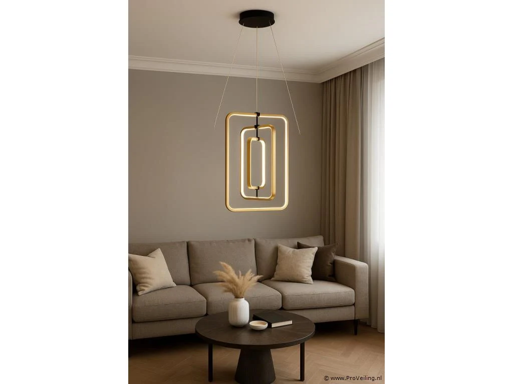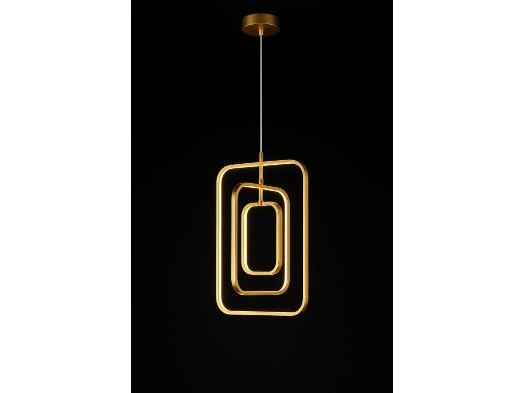 LED hanglamp model 5835/3 – Totaal vermogen 45W – Elegante gouden afwerking – Modern rechthoekig designE met drie lichtelementen (500×330 mm, 400×270 mm en 300×210 mm) – In hoogte verstelbaar – Lichtbron: geïntegreerde LED-strip – Spanning: 220-240V (50/60 Hz) – Inclusief montageset – Ideaal voor verfijnde binnenverlichting: woonkamers, eetkamers of kantoren.
