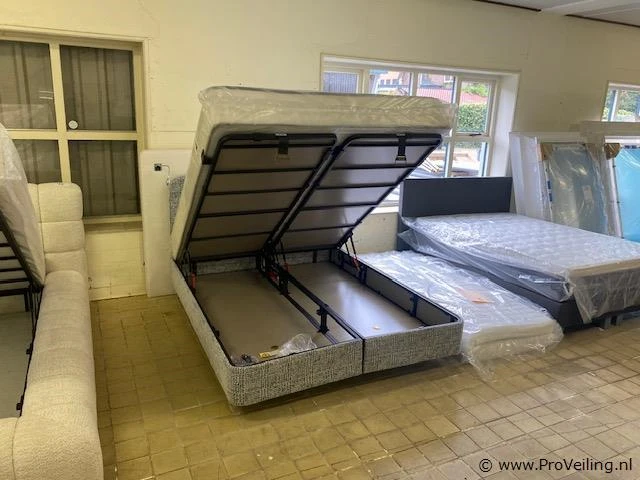 Luxe opberg boxspring; afmetingen 160 x 200cm. Hoofdbord dubbel lichtgrijs.