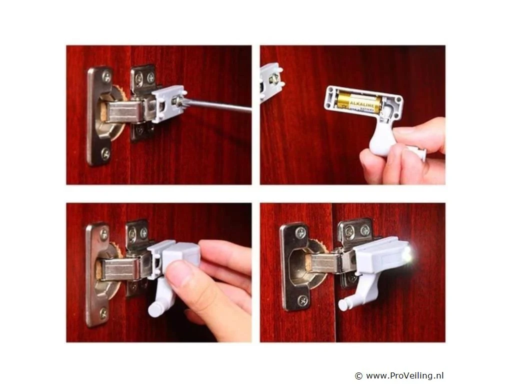 Eenvoudig te plaatsen op de kastscharnier-zorgt voor licht bij het openen van de kast -bij sluiten gaat het licht weer uit-Automatische kast verlichting te plaatsen op het scharnier.-werkt op een battery-battery niet meegeleverd