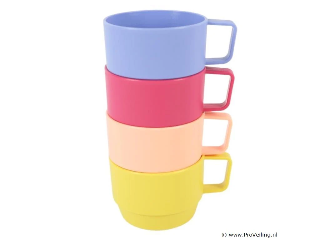 Set van 4 kunststof bekers van Norlander in verschillende vrolijke kleuren. Inhoud 300 ml. Vaatwasser- en magnetronbestendig. Niet geschikt voor gebruik in de oven. Ideaal voor kamperen, picknicks of buitengebruik.