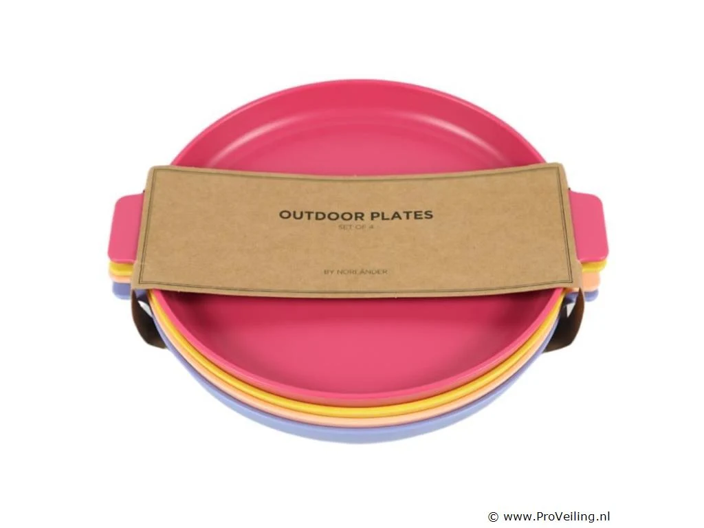 Set van 4 kunststof borden van Norlander in verschillende vrolijke kleuren.23,5 cm diameter .Vaatwasser- en magnetronbestendig. Niet geschikt voor gebruik in de oven. Ideaal voor kamperen, picknicks of buitengebruik.