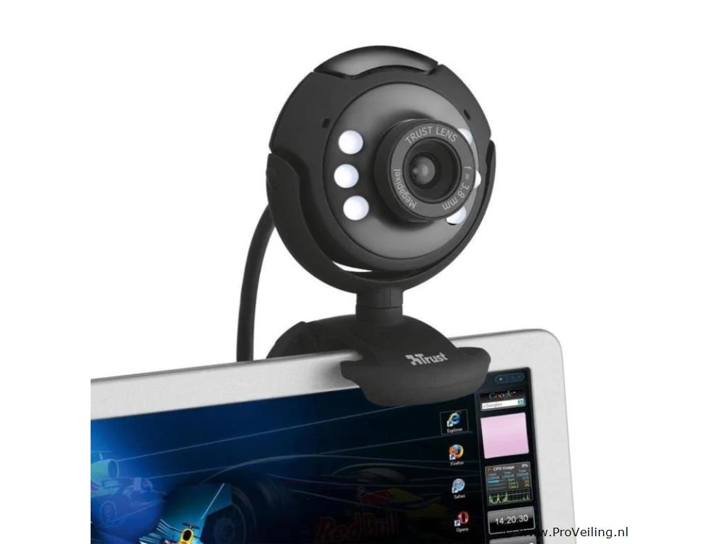 Spotlight Pro webcam van Trust. De webcam is zwart van kleur en beschikt over 6 dimbare LED lampjes. De camera heeft een 640 x 480 resolutie en een ingebouwde microfoon, De webcam kun je bovenop je laptop of computerscherm klemmen, maar kan ook gewoon op een vlakke ondergrond worden gezet. De kabel heeft een lengte van 170 cm en heeft een USB aansluiting. Werkt op Windows, Mac en OS. Systeem 10, 8 en 7.USB-poort.Mac OS X (10.15 of nieuwer)