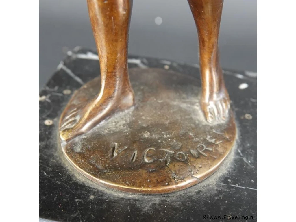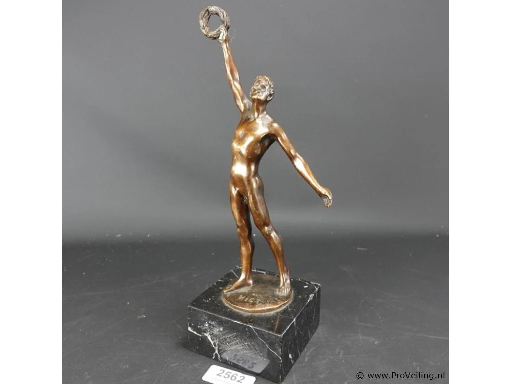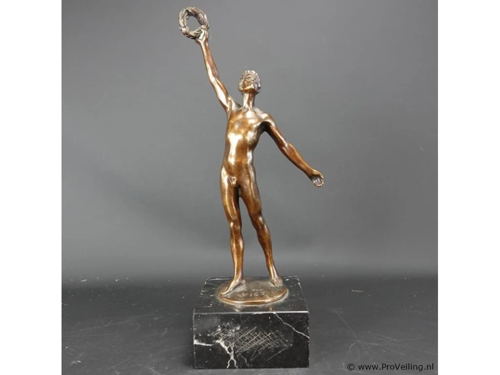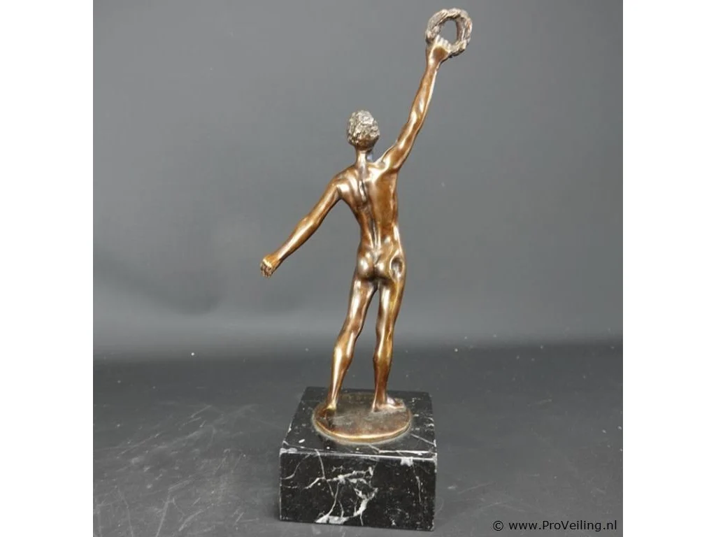 Beeld "l' atlète victorieux" van op de Olympische Spelen 1920 in Antwerpen. Op marmeren basement. H34cm/2515Gr. Verwachte opbrengst € 100,00 - € 200,00. Reserve. Lees a.u.b. ook de extra veilinginformatie voor deze veiling!.