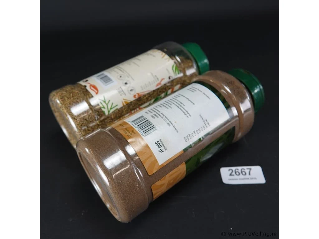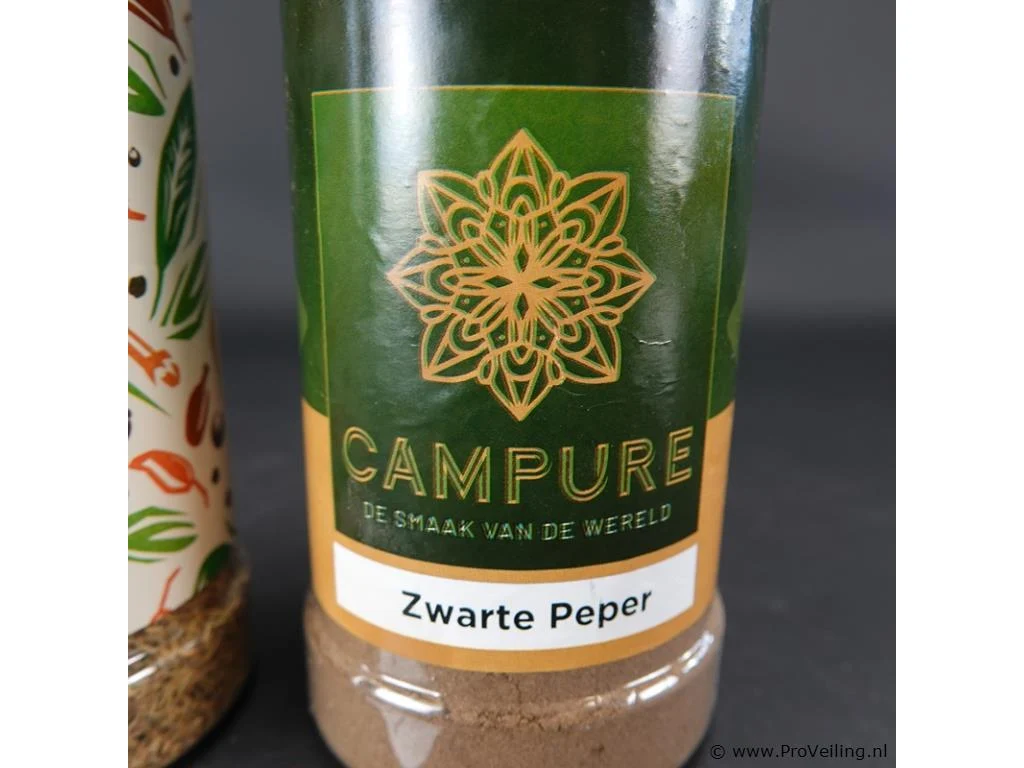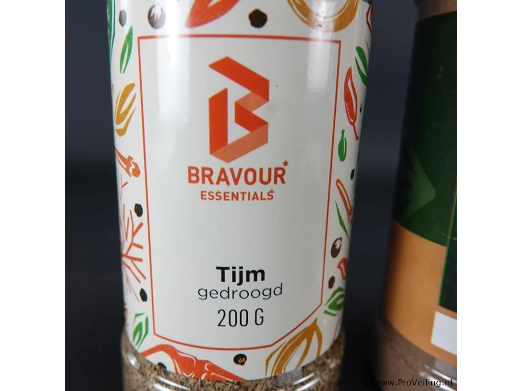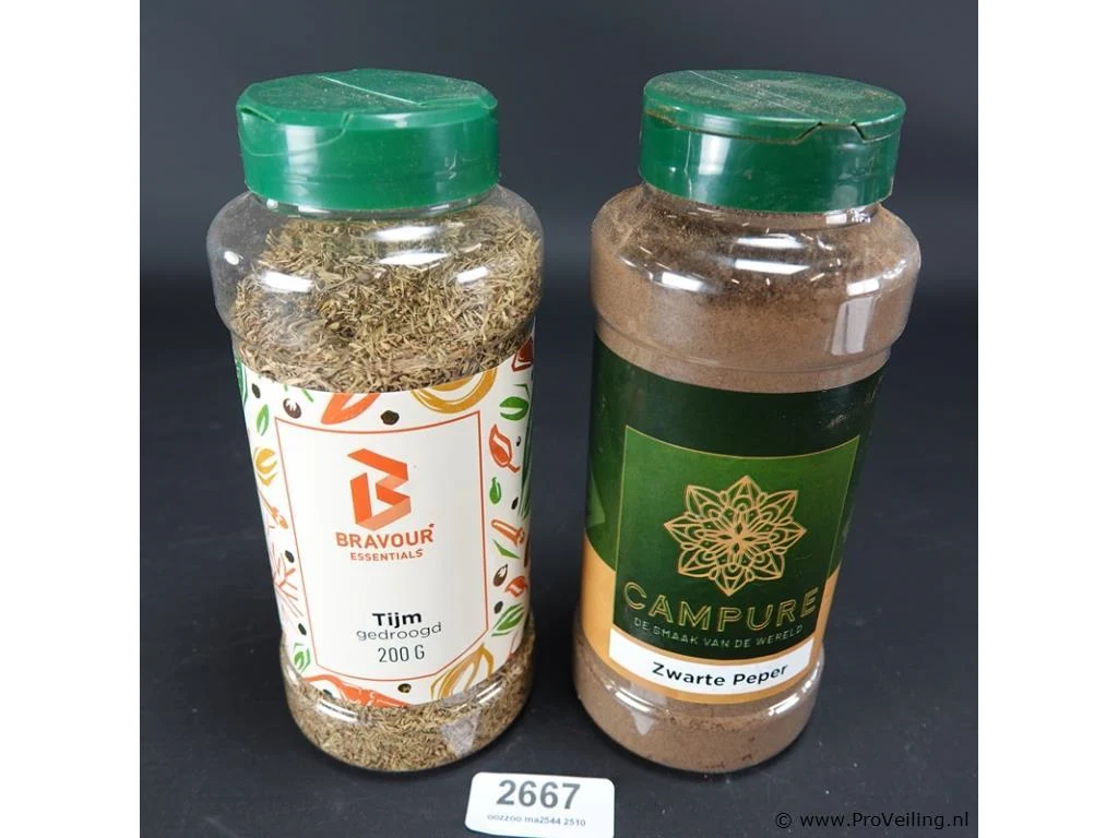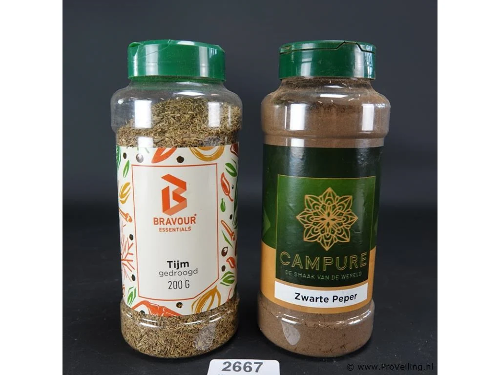 Volle pot tijm (Bravour) en zwarte peper (Campure). Ten minste houdbaar tot 15-11-2026. H22cm/858Gr. Lees a.u.b. ook de extra veilinginformatie voor deze veiling!.
