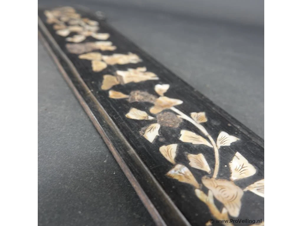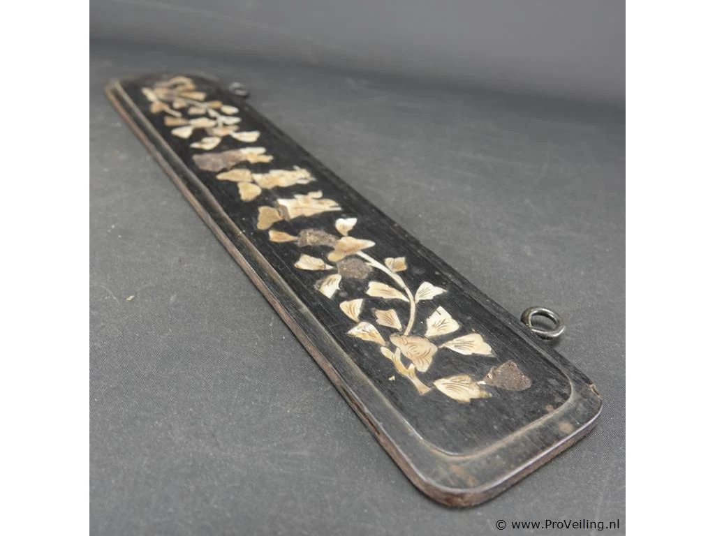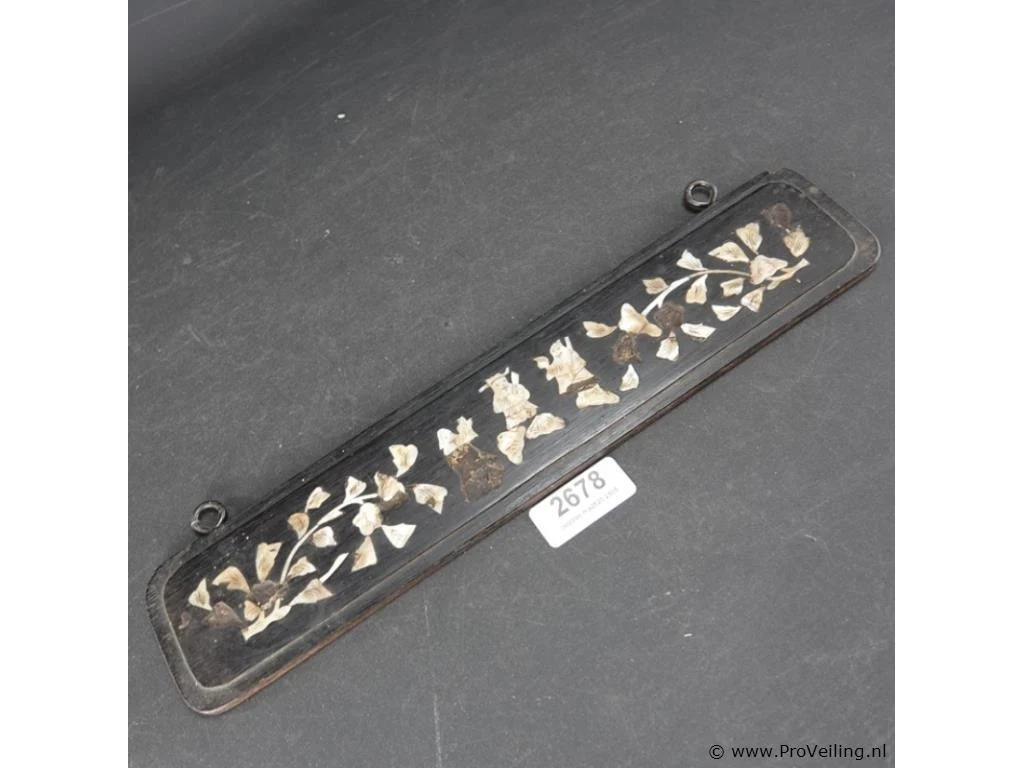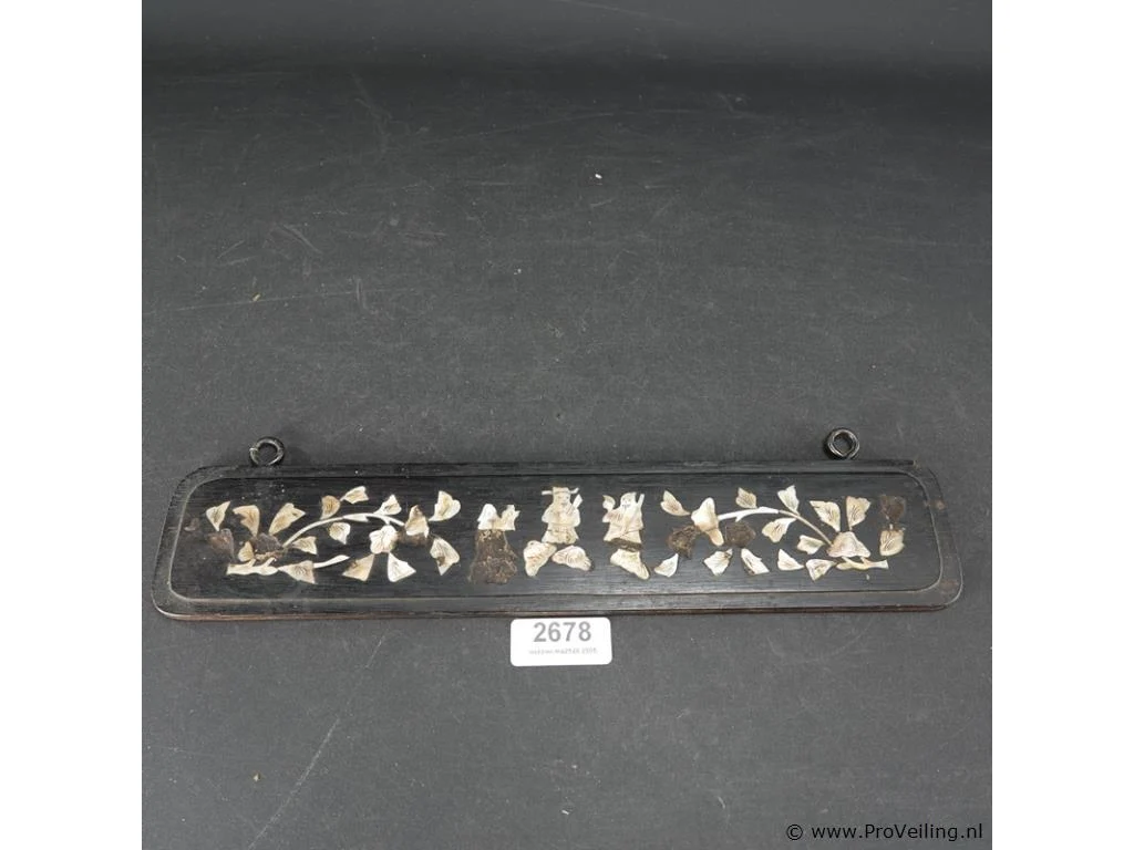 Oosterse paarlemoer voorstelling op laqué plank. Als op foto's. H8cm/B38cm/266Gr. Dit betreft een tijdens transport kwetsbaar product! Uw transportrisico voor deze kavel is zeker in combinatie met andere kavels hoog. Lees daarom a.u.b. ook de extra veilinginformatie voor deze veiling!.