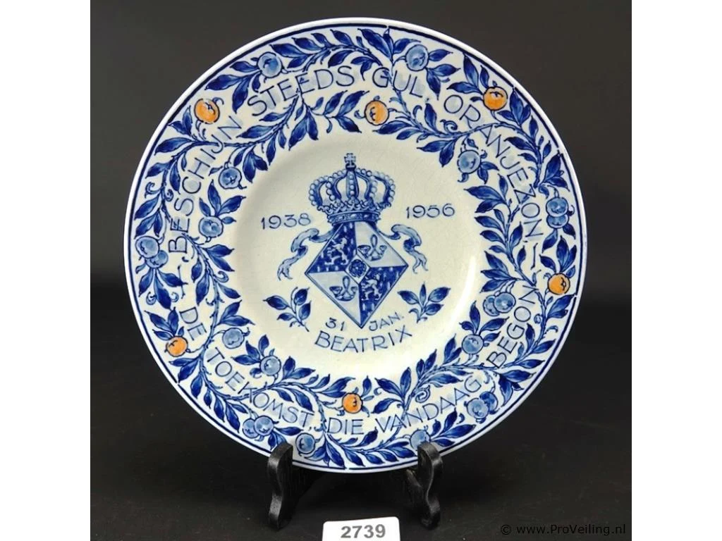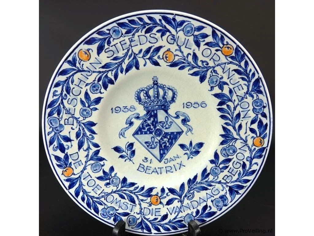 De porceleyne fles koninklijke herdenkings breedrandbord prinses beatrix 18 jaar oud - 1956