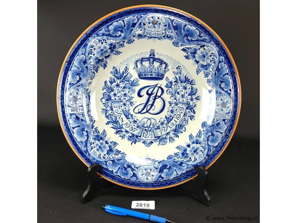 De Porceleyne Fles Herdenkings Schotel 12,5 jaar Huwelijk Koningin Juliana & Prins Bernhard 1937 - 1949. Aan onderzijde gemerkt. H4cm/D36cm/1165Gr. Dit betreft een tijdens transport kwetsbaar product! Uw transportrisico voor deze kavel is zeker in combinatie met andere kavels hoog. Lees daarom a.u.b. ook de extra veilinginformatie voor deze veiling!.
