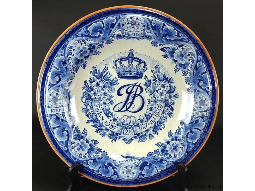 De porceleyne fles herdenkings schotel 12,5 jaar huwelijk koningin juliana & prins bernhard 1937 - 1949
