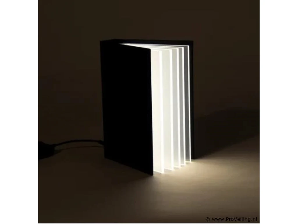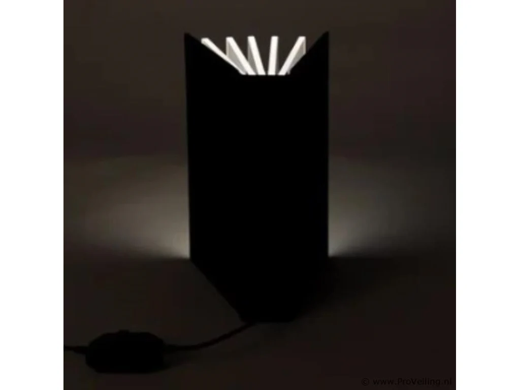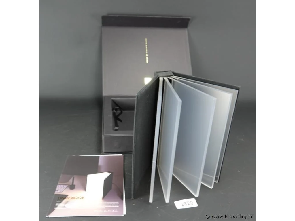 In originele cassette. 5 acryl pagina's 6 mm - omslag: zwart linnen. Licht: LED - 3500 K - dimbaar. Handgemaakt in gelimiteerde oplage. Van de designer: Light Book weerspiegelt mijn blijvende fascinatie voor boeken. Light Book is een handgemaakte bol en leeslamp die je net als een echt boek kunt openen en sluiten en horizontaal of verticaal kunt positioneren. Light Book bestaat uit 5 acrylpagina's van 6 mm dik met witte 3500 K dimbare ledlampjes. De omslag is handgemaakt van zwart linnen. Light Book is een klein, kostbaar lichtobject dat je ruimte kan verlichten en deze een verrassend andere, poëtische dimensie kan geven. H24cm/L17cm/D5cm/2625Gr. Verwachte opbrengst € 200,00 - € 300,00. Reserve. Dit betreft een tijdens transport kwetsbaar product! Uw transportrisico voor deze kavel is zeker in combinatie met andere kavels hoog. Lees daarom a.u.b. ook de extra veilinginformatie voor deze veiling!.