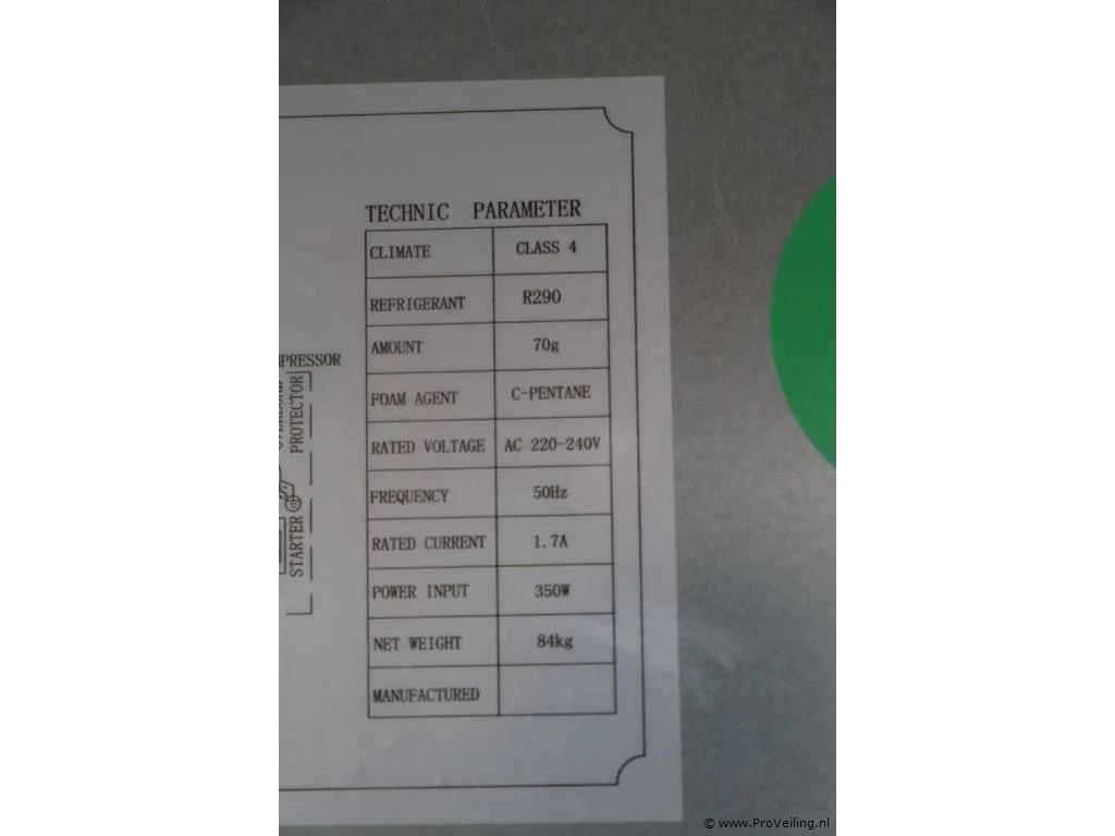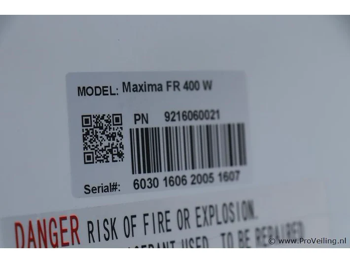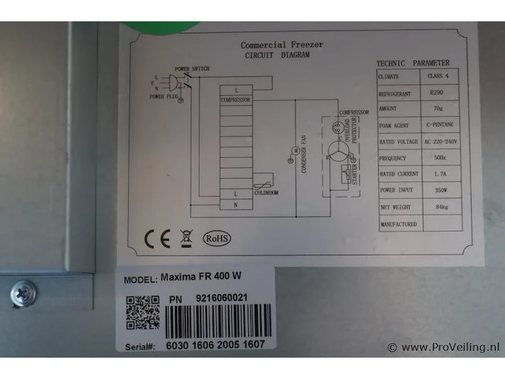Vrieskast: merk Maxima; model Maxima FR 400 W; gewicht ca. 84kg; afmetingen ca. 60x64x186cm.