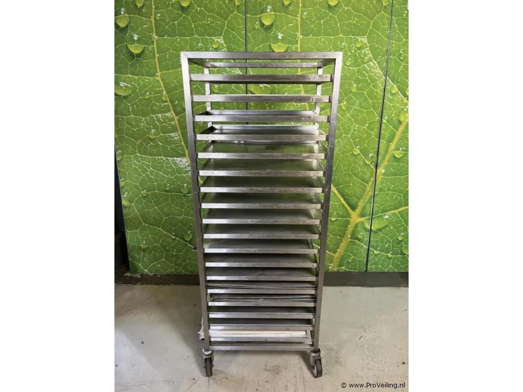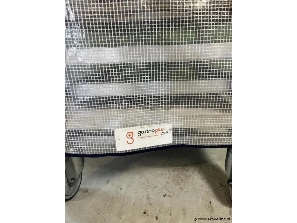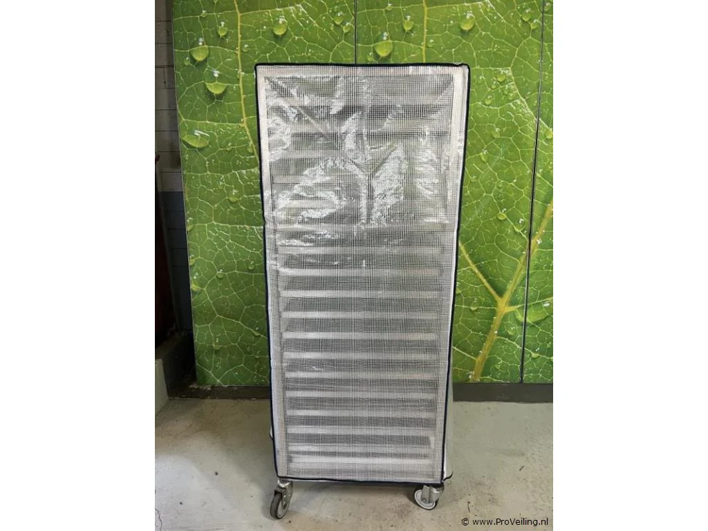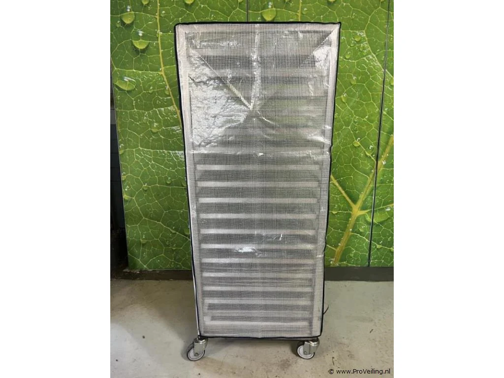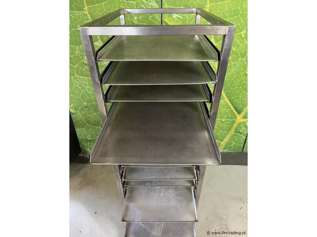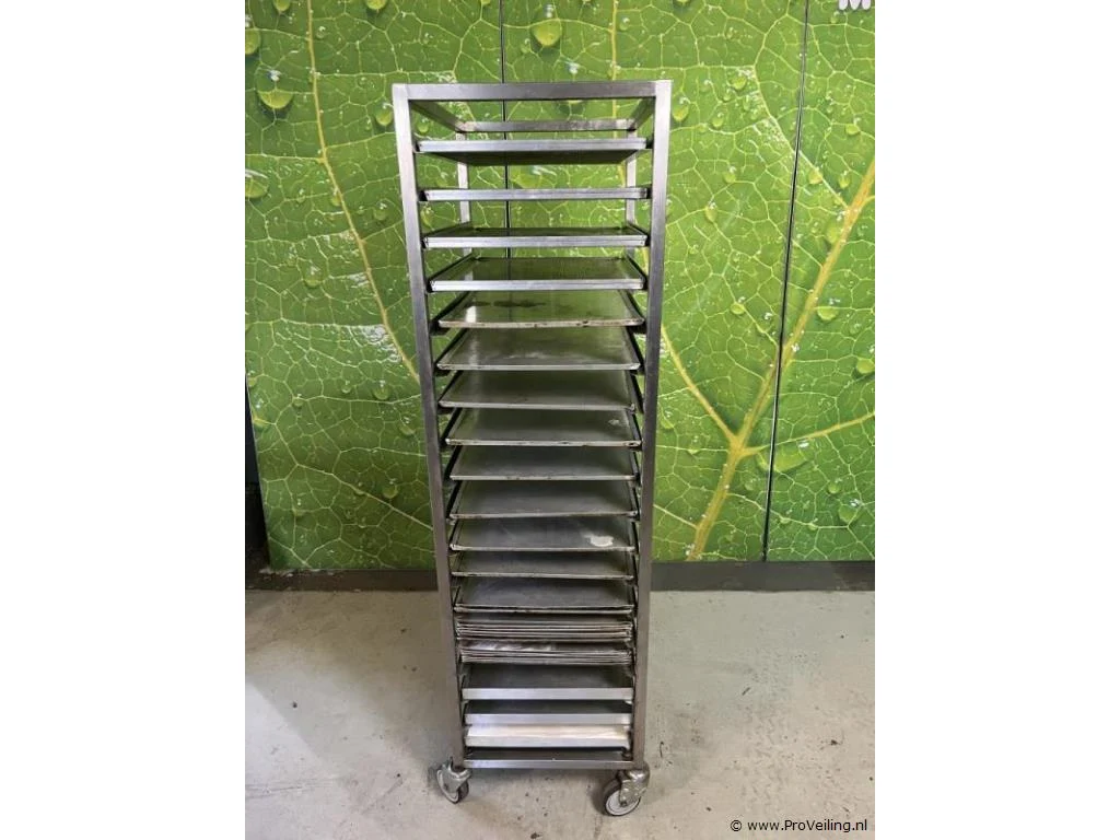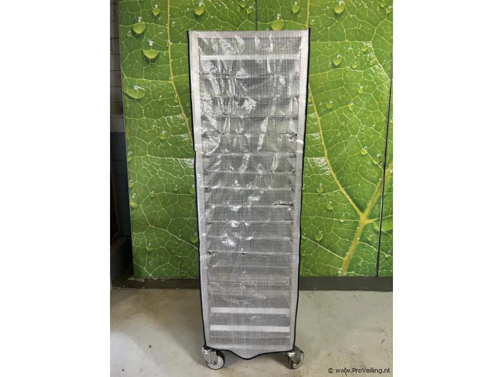Regaalwagen; afmetingen ca. 46x62x162cm; incl. Gastroplus afdekhoes & (bak) platen ca. 3x hoge rand, 22x lage rand & 4x geperforeerde (bak) platen; zie afbeeldingen.