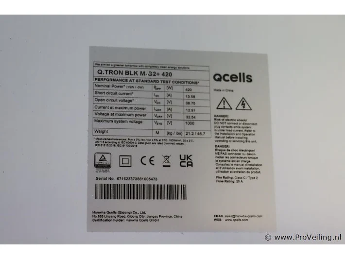 Zonnepanelen: merk Qcells; type Q.Tron BLK M-G2-420; afmetingen ca. 172x114x3cm; aantal ca. 4 stuks.