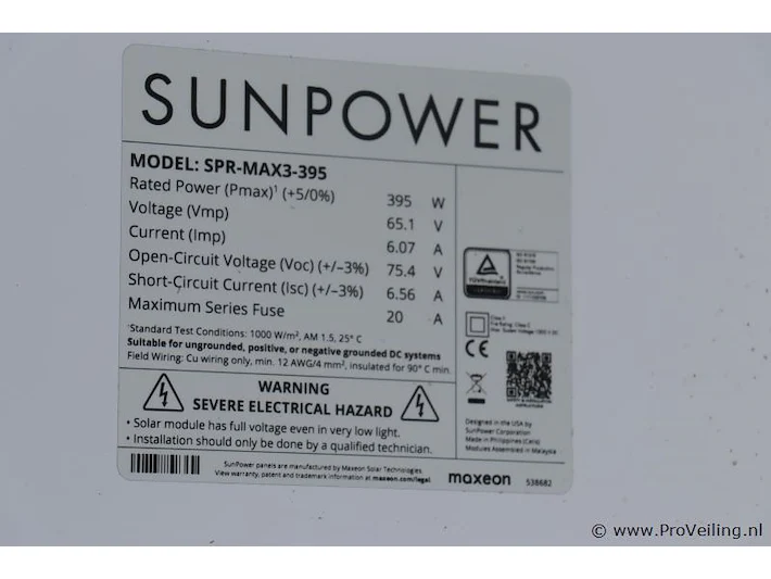 Zonnepanelen: merk Sunpower; model SPR-MAX3-395 | AR-H1 M4.2 B1L MC4 IT; afmetingen ca. 169x104x4cm; aantal ca. 3 stuks.