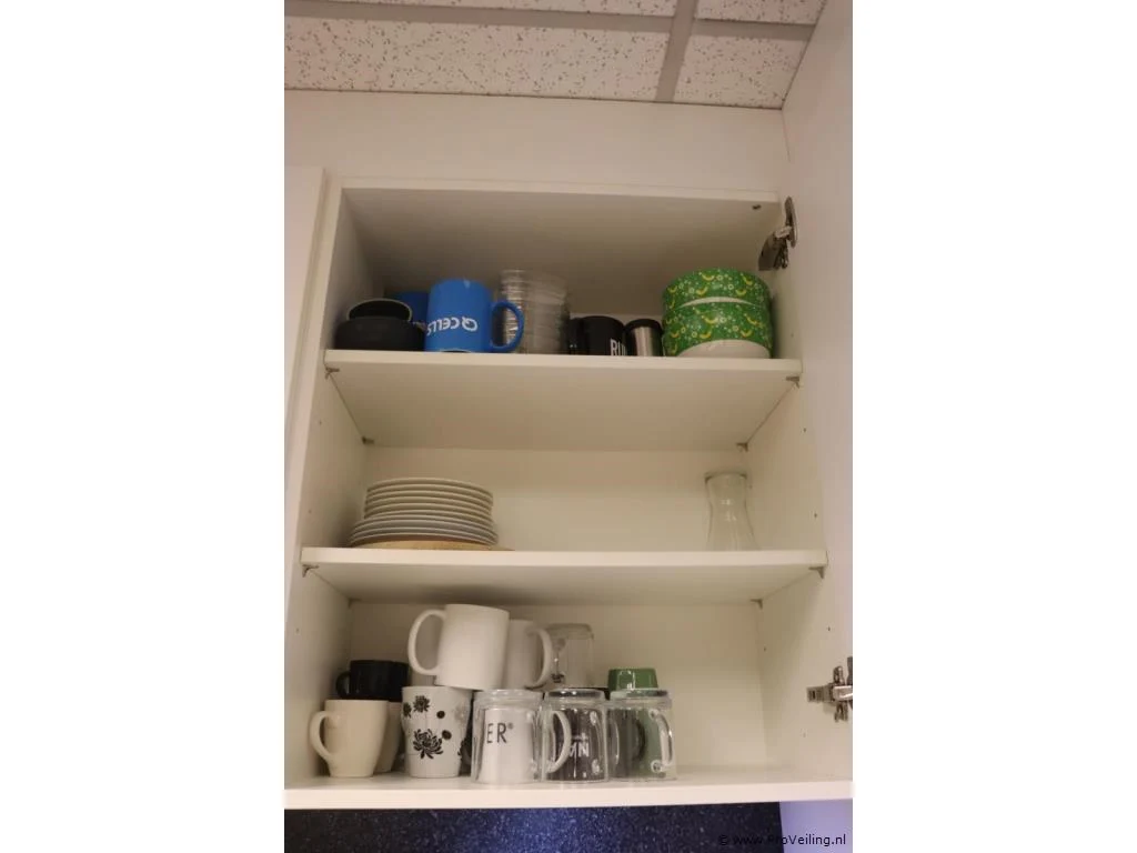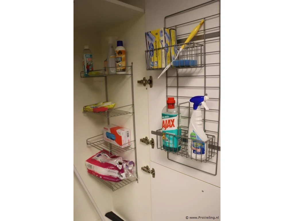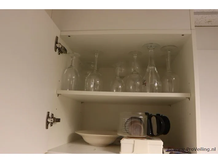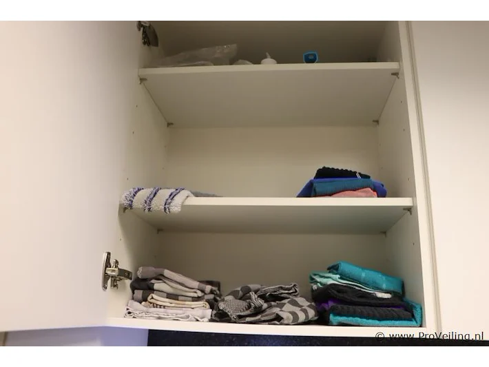 Inhoud keukenkastjes bestaande uit o.a. theedoeken, vaatdoekjes, dweil, wijnglazen en schoonmaakmiddelen