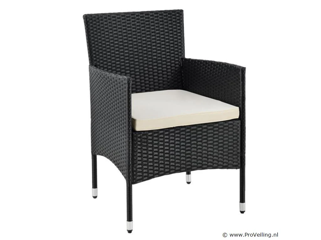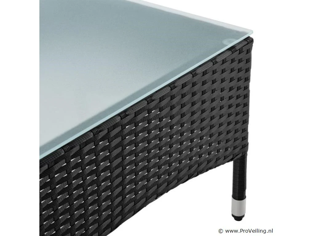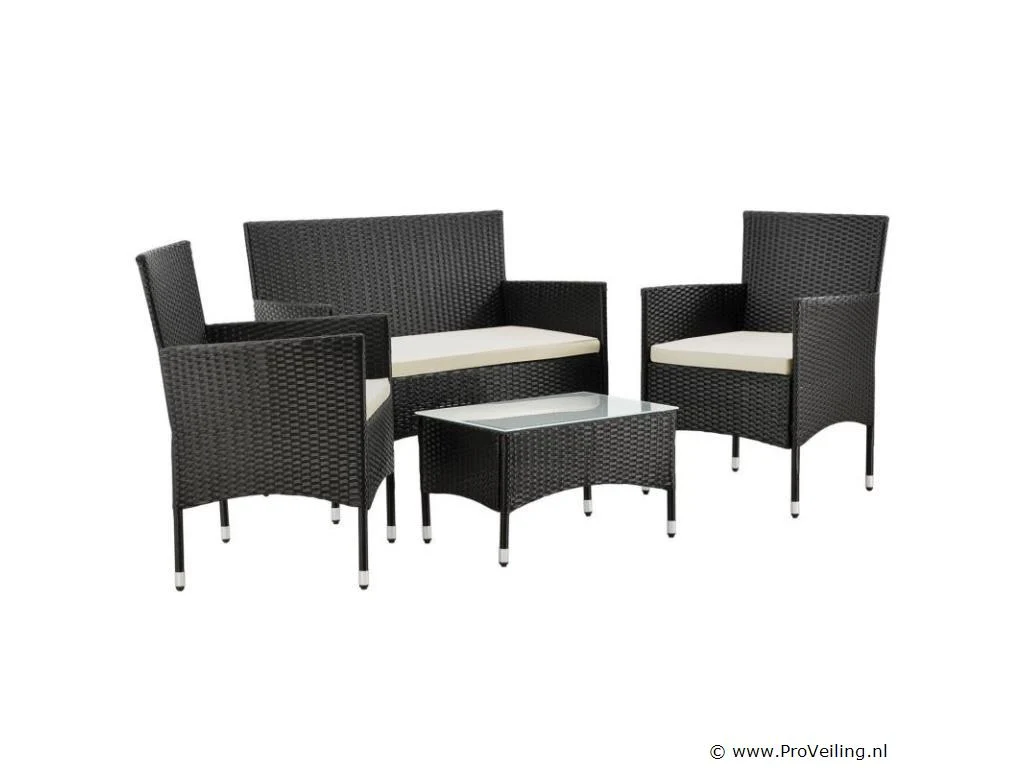 De poly rotan zitgroep Fort Myers (zwart met creme en witte hoezen) dient als comfortabele lounge voor 4 personen. Met de edele rotan-look verfraait hij elke tuin, terras of balkon. Uitgerust met een rugleuning en kussens, is de tuinset perfect om vele uren door te brengen met familie en vrienden. De 4-delige tuinmeubelset met een stevig metalen frame bestaat uit een 2-zitsbank, twee fauteuils en een kleine bijzettafel met glazen blad. De balkonset is geschikt om gasten in stijl te ontvangen. Zet drankjes en hapjes op tafel en geniet samen van de zomer. Technische specificaties: Materiaal frame: staal, gepoedercoat Materiaal weefsel: polyrotan, gevlochten Materiaal zitkussens: schuim Materiaal hoezen: polyester Materiaal glasplaat: glas (veiligheidsglas) Vlechtkleur: zwart Kleur omslag: cremewit Aantal zitplaatsen: Voor 4 personen Stijl, design: moderne rotan-look Afmetingen (ongeveer): Afmetingen tuintafel: 60 × 35 × 35 cm Afmeting bank: 95 × 52 × 85 cm Afmetingen tuinstoelen: 51 × 52 × 85 cm Hoogte rugleuning vanaf vloer: 85 cm Hoogte armleuning vanaf vloer: 61 cm Zithoogte zonder bekleding: 41 cm Dikte zitkussen: 5 cm Leveringsomvang: 1 x glazen tafel 2 x stoelen 1 x 2-zits zitbank 1 x groot zitkussen 2 x kleine zitkussens 1 x montagehandleiding