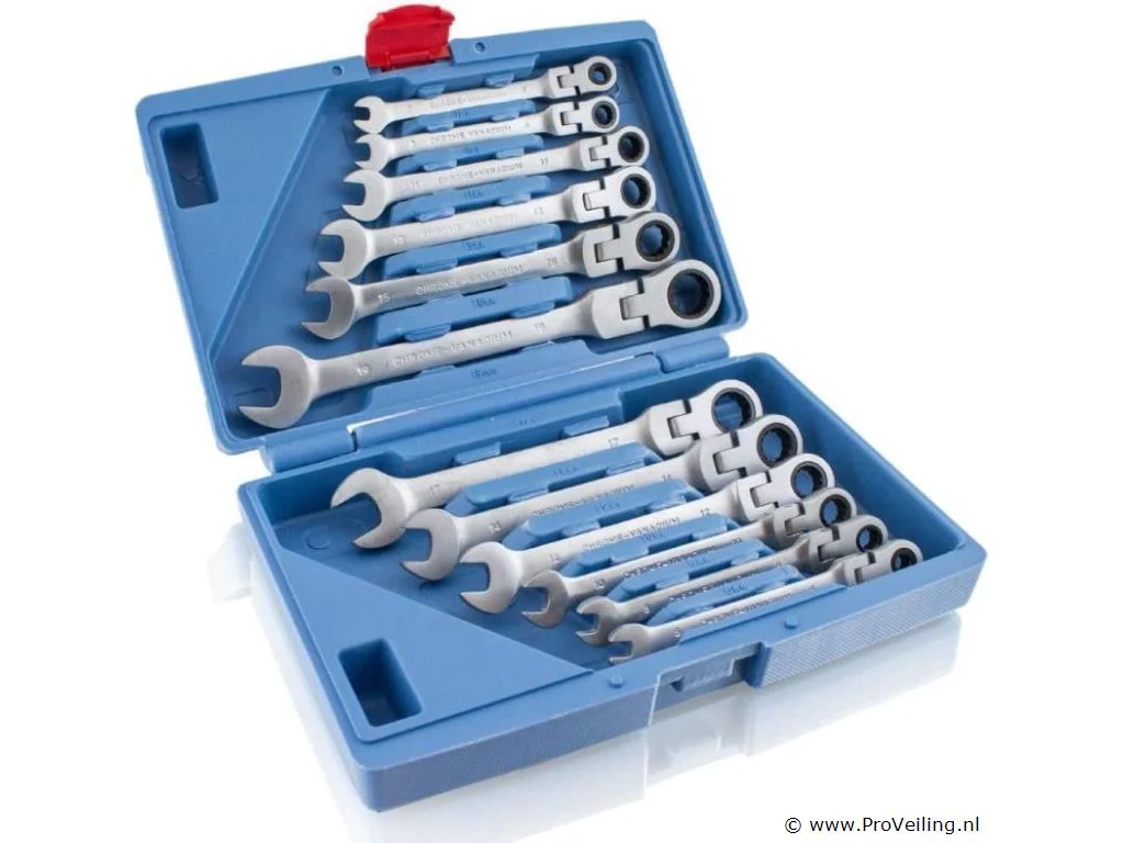 De set bestaat uit 12 ratelsleutels met scharnierkoppen, waarmee je ook op moeilijk bereikbare plaatsen kunt werken. De gereedschappen zijn gemaakt van robuust en duurzaam chroom-vanadiumstaal Ratelsleutels: 6 mm, 7 mm, 8 mm, 9 mm, 10 mm, 11 mm, 12 mm, 13 mm, 14 mm, 15 mm, 17 mm, 19 mm (5 graden terughaalhoek / 72 tanden) Praktisch en overzichtelijk, veilig opgeborgen in de kunststof koffer Technische specificaties: Maten: 6 mm, 7 mm, 8 mm, 9 mm, 10 mm, 11 mm, 12 mm, 13 mm, 14 mm, 15 mm, 17 mm, 19 mm Aantal tanden: 72 Resethoek: 5 graden Materiaal kast: kunststof Gereedschapsmateriaal: chroom-vanadiumstaal Leveringsomvang: 1x ratelsleutel met scharnier: 6 mm, 7 mm, 8 mm, 9 mm, 10 mm, 11 mm, 12 mm, 13 mm, 14 mm, 15 mm, 17 mm, 19 mm