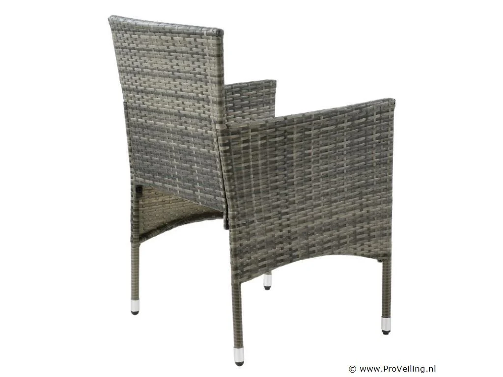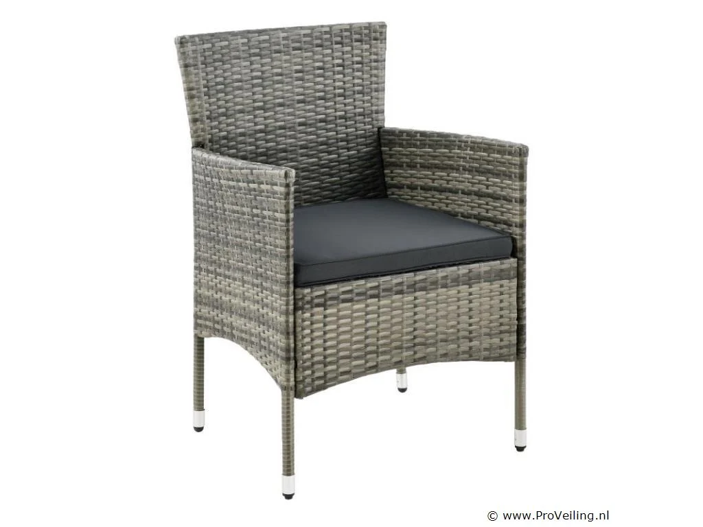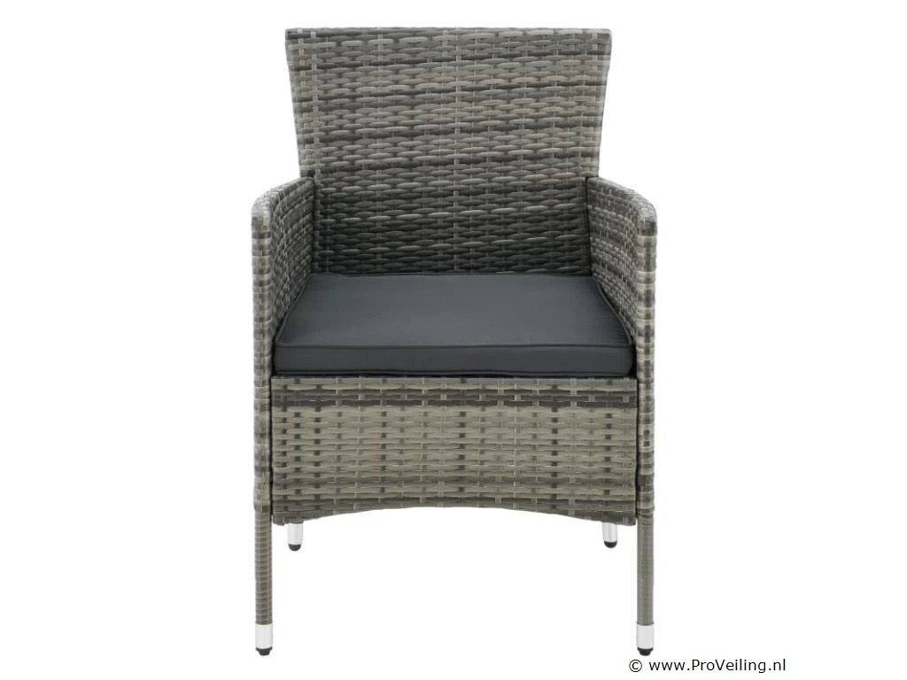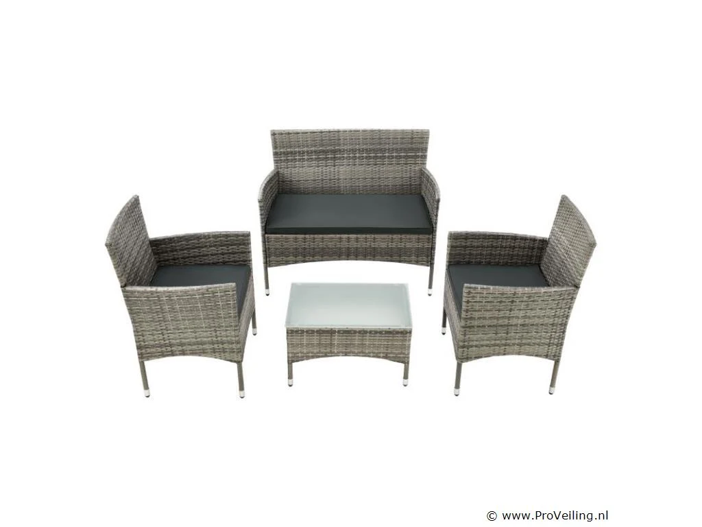De Fort Myers poly rotan zitgroep (grijs gemêleerd met donkergrijze hoezen) dient als comfortabele lounge voor 4 personen. Met de edele rotan-look verfraait hij elke tuin, terras of balkon. Uitgerust met een rugleuning en kussens, is de tuinset perfect om vele uren door te brengen met familie en vrienden. De 4-delige tuinmeubelset met een stevig metalen frame bestaat uit een 2-zitsbank, twee fauteuils en een kleine bijzettafel met glazen blad. De balkonset is geschikt om gasten in stijl te ontvangen. Zet drankjes en hapjes op tafel en geniet samen van de zomer. Technische specificaties: Materiaal frame: staal, gepoedercoat Materiaal weefsel: polyrotan, gevlochten Materiaal zitkussens: schuim Materiaal hoezen: polyester Materiaal glasplaat: glas (veiligheidsglas) Vlechtkleur: grijs gemêleerd Kleur bekleding: donkergrijs Aantal zitplaatsen: Voor 4 personen Stijl, design: moderne rotan-look Afmetingen (ongeveer): Afmetingen tuintafel: 60 × 35 × 35 cm Afmeting bank: 95 × 52 × 85 cm Afmetingen tuinstoelen: 51 × 52 × 85 cm Hoogte rugleuning vanaf vloer: 85 cm Hoogte armleuning vanaf vloer: 61 cm Zithoogte zonder bekleding: 41 cm Dikte zitkussen: 5 cm Leveringsomvang: 1 x glazen tafel 2 x stoelen 1 x 2-zits zitbank 1 x groot zitkussen 2 x kleine zitkussens 1 x montagehandleiding