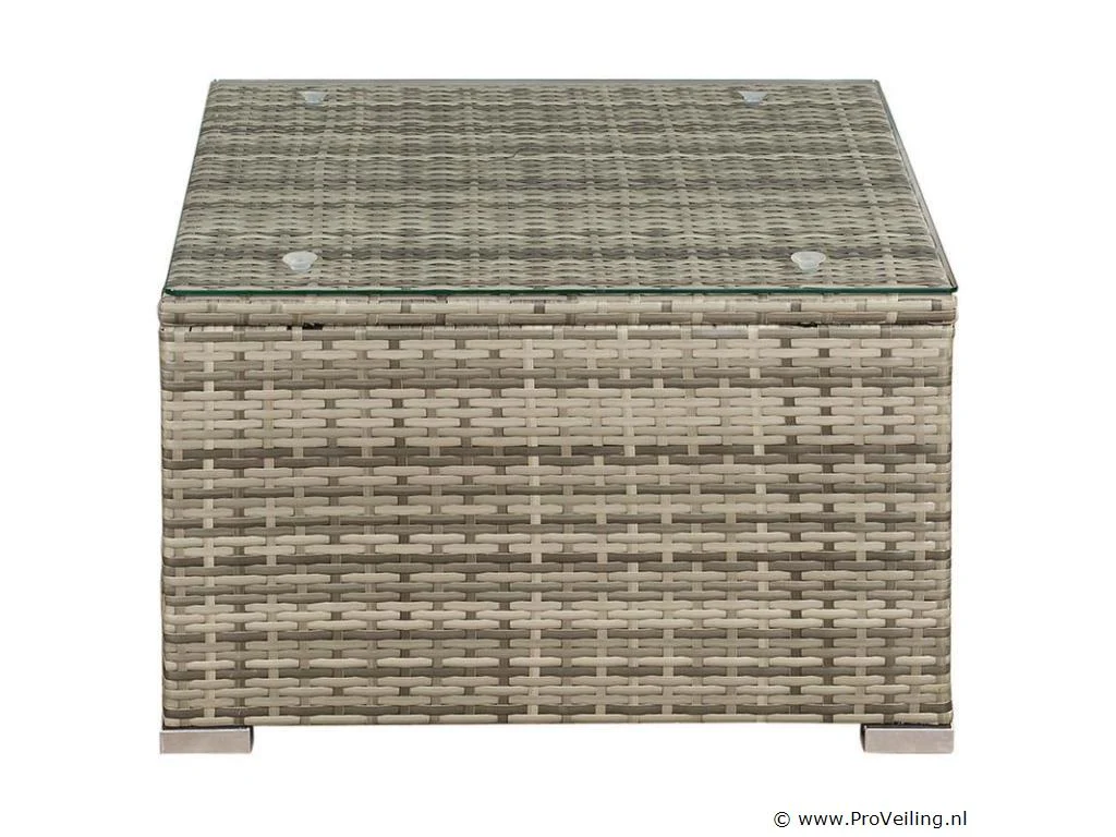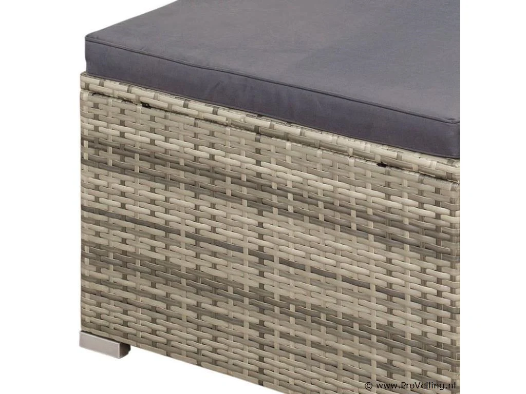 Ben je op zoek naar een comfortabele en grote loungeset voor in je tuin, terras of balkon? Met de zitset "Punta Cana L" verander je je buitenruimte in een stijlvolle plek om te ontspannen en je goed te voelen. Gezellige avonden met familie, vrienden of buren worden een belevenis in de buitenlucht. De unieke rotan look in grijs-beige met grijze vulling geeft je nieuwe loungemeubel een moderne charme. Creëer je eigen oase van welzijn om te ontspannen en samen te zitten. Technische specificaties: Materiaal: Weefsel: polyrotan vezels Frame: staal Tafelblad: glas Zitkussens: schuim Hoezen: 100% polyester Zithoogte: 37 cm Dikte zitkussen: 5 cm Dikte glasplaat: 0,5 cm Kleur: Vlecht: grijs gemêleerd Kussenslopen: donkergrijs Afmetingen (ongeveer): Bank: 178 × 69 × 65 cm (L x B x H) Fauteuil: 70 × 69 × 65 cm (L x B x H) Tafel: 61 × 61 × 37 cm (L x B x H) Kruk: 61 × 61 × 37 cm (L x B x H) Dikte zitkussen: 5 cm Dikte glasplaat: 0,5 cm Breedte rugkussen: 54 cm Zitkruk: 60 × 60 cm Leveringsomvang: 1 x tafel 1 x Bank 1 x fauteuil 1 x kruk 5 x zitkussens 4 x rugkussens 1 x montage-instructies Let op: U ontvangt het product goed verpakt als bouwpakket voor zelfmontage per pakketdienst. Dit artikel bestaat uit 2 dozen, het kan logistiek voorkomen dat het in meerdere dagen geleverd wordt.