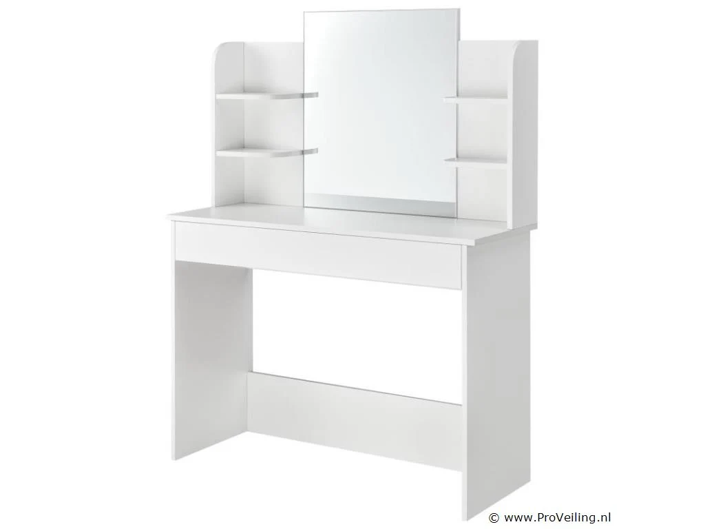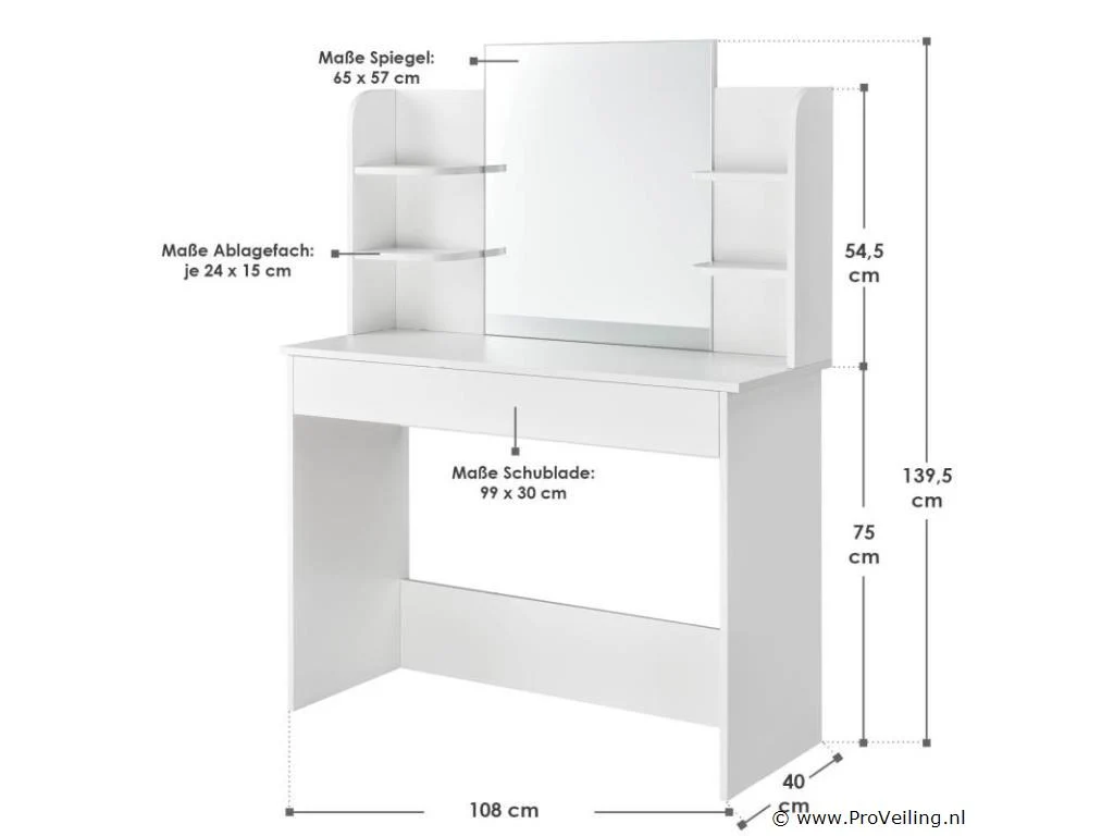 Ben je op zoek naar een moderne cosmeticatafel voor je dagelijkse styling? De prachtige Bella kaptafel met grote spiegel is daar de perfecte plek voor! Stijl jezelf hier comfortabel voor het dagelijks leven. Want in de ruime lade en in de 4 vakken berg je je cosmetica altijd bij de hand en netjes op. De make-uptafel met spiegel is ook visueel indrukwekkend. Dankzij het eenvoudige design met rechte lijnen fleurt hij elke kinderkamer en slaapkamer op. Zelfs jonge mensen zullen de moderne make-uptafel meteen leuk vinden! Bovendien is het product van gelakt MDF-hout extreem stabiel en onderhoudsvriendelijk. Technische specificaties: Materiaal ladekast: MDF houtvezelplaten Kleur kaptafel: Wit Aantal make-up spiegels: 1 Aantal lades: 1 Aantal opbergvakken: 4 Afmetingen (ongeveer): Dressoir: 108 × 40 × 140 cm (L x B x H) Spiegel: 65 × 57 cm (H x B) Lade: 99 × 30 cm (L x B) Vakken: elk 24 × 15 cm (L x B) Hoogte tafelblad: 75 cm Leveringsomvang: 1 x kaptafel met spiegel 1 x Instructie