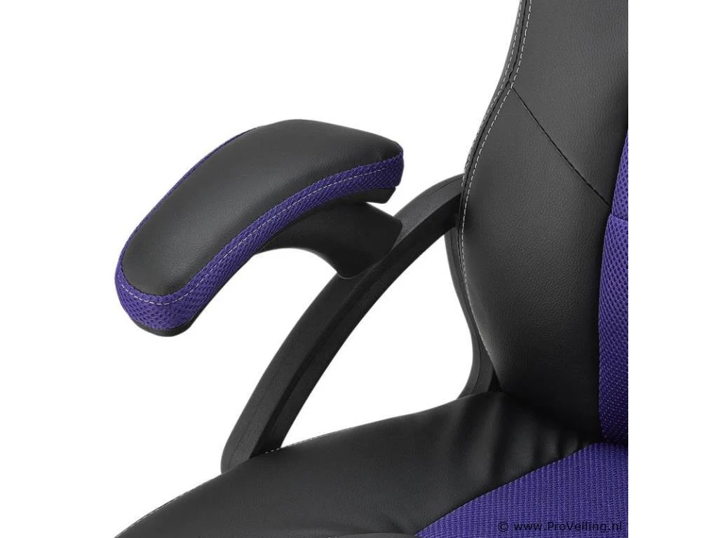 De gezellige Racing bureaustoel Montreal (paars) overtuigt met een hoog zitcomfort. Met zijn ergonomisch gevormde zitting, de kantelbare rugleuning en zitting en de gecapitonneerde armleuningen laat de moderne bureaustoel in trendy racer design urenlang comfortabel zitten. De draaistoel is daarom ideaal om thuis op kantoor te werken, huiswerk te maken en te leren, en voor gepassioneerde gamers om op de computer te spelen. Technische specificaties: Materiaal: kunststof, metaal, imitatieleer, mesh inzetstuk Kunstleer kleur: Zwart Mesh kleur: paars Maximale belasting: 120 kg Afmetingen (ongeveer): Totale hoogte: 101 - 111 cm Hoogte rugleuning: 65 × 66 cm Zitting: 47 x 52 cm Zithoogte: 46 - 56 cm Zitbreedte: 47 cm Zitdiepte: 52 cm Leveringsomvang: 1 × bureaustoel 1 × montage-instructies