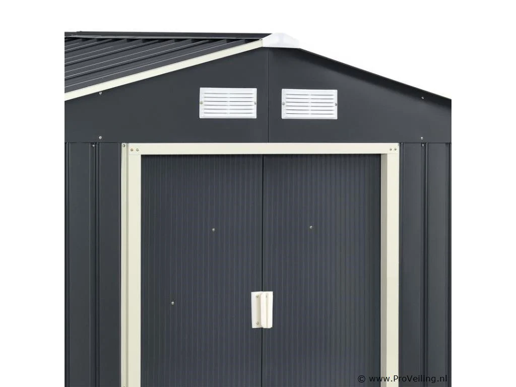 Creëer orde in je tuin - met de moderne XL metalen gereedschapsschuur met schuin dak. Maak een einde aan roestig tuingereedschap of lelijke geïmproviseerde hoezen. Tuinmeubelen, tuingereedschap en fietsen vinden een beschutte plek in de ruime gereedschapsschuur. Zo berg je je outdoor spullen droog, schoon en netjes op. Een onderstel van metaal en een praktische dubbele schuifdeur maken de uitrusting compleet. Nog een pluspunt: ventilatieroosters zorgen voor een goede luchtcirculatie. Technische specificaties: Materiaal tuinhuisje: plaatstaal, kunststof Materiaal fundering: metalen frame Kleur antraciet Bergruimte: ca. 9 m³ Afmetingen (ongeveer): Totale afmetingen: 277 × 191 × 192 cm Interne afmetingen: 267 × 181 × 187 cm Afmetingen voet: 267 × 181 cm Nokhoogte: 192 cm Hoogte dakrand: 152 cm Deur: 96 x 152 cm Leveringsomvang: 1 x metalen gereedschapsschuur 1 x funderingsframe 1 x montage-instructies Dit artikel bestaat uit 3 dozen, het kan logistiek voorkomen dat het in meerdere dagen geleverd wordt.