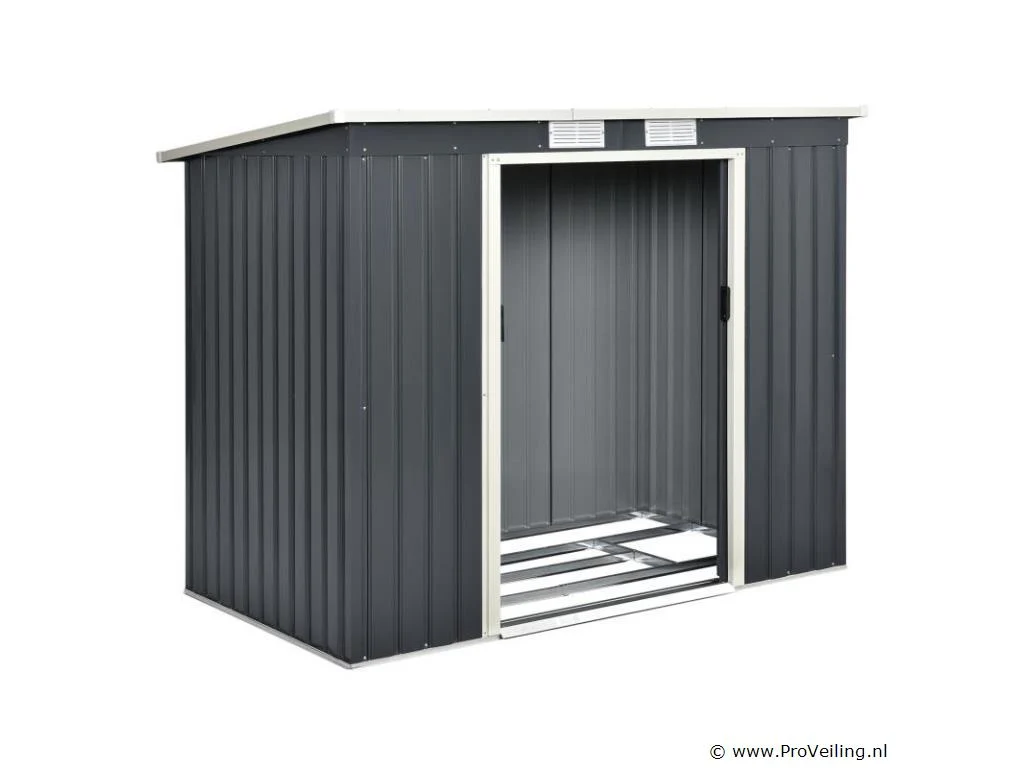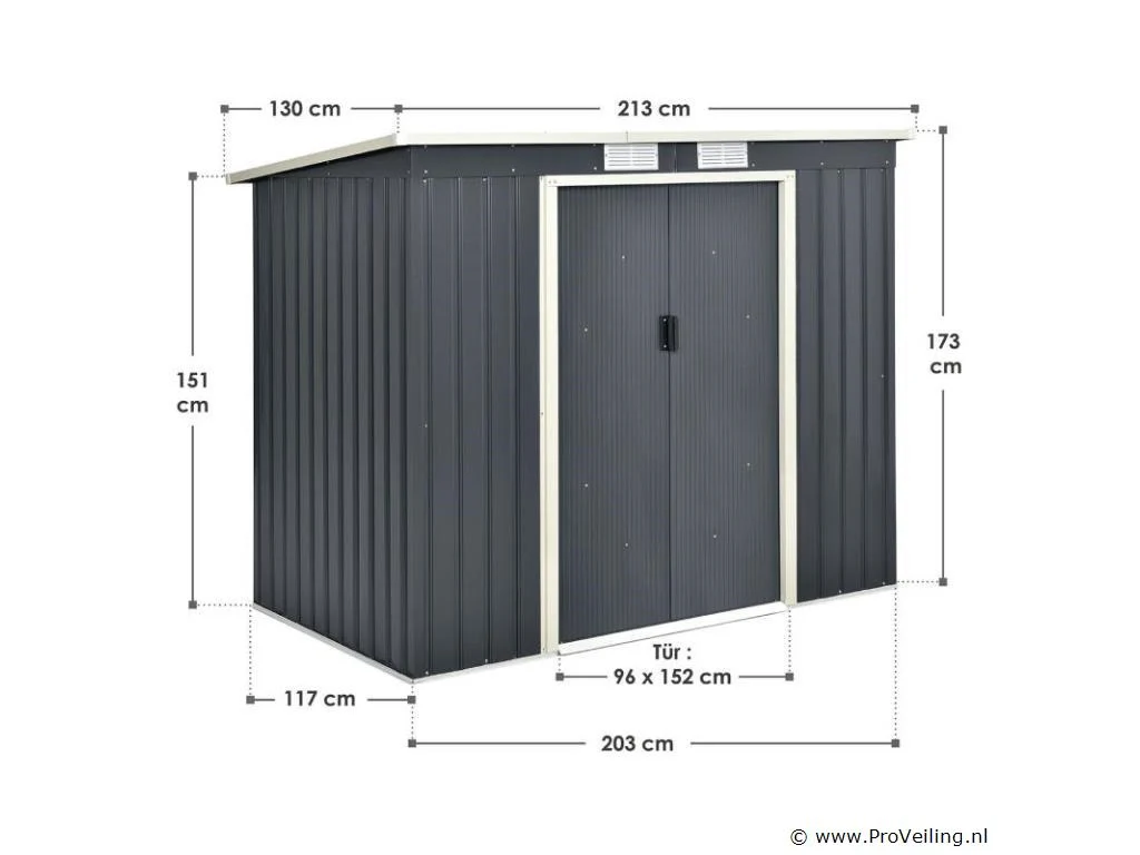Creëer orde in je tuin - met de moderne metalen gereedschapsschuur met lessenaarsdak in maat M. Maak een einde aan roestig tuingereedschap of lelijke geïmproviseerde afdekkingen. Tuinmeubelen, tuingereedschap en fietsen vinden een beschutte plek in de ruime gereedschapsschuur. Zo berg je je outdoor spullen droog, schoon en netjes op. Een basisframe van metaal en een praktische dubbele schuifdeur ronden de uitrusting af. Nog een pluspunt: ventilatieroosters zorgen voor een goede luchtcirculatie. Technische specificaties: Materiaal tuinhuisje: plaatstaal, kunststof Materiaal fundering: metalen frame Kleur antraciet Bergruimte: ca. 4 m³ Afmetingen (ongeveer): Totale afmetingen: 213 × 130 × 173 cm Binnenafmetingen: 203 × 117 × 170 cm Afmetingen voet: 203 × 117 cm Nokhoogte: 173 cm Hoogte dakrand: 152 cm Deur: 96 x 152 cm Leveringsomvang: 1 x metalen gereedschapsschuur 1 x funderingsframe 1 x montagehandleiding