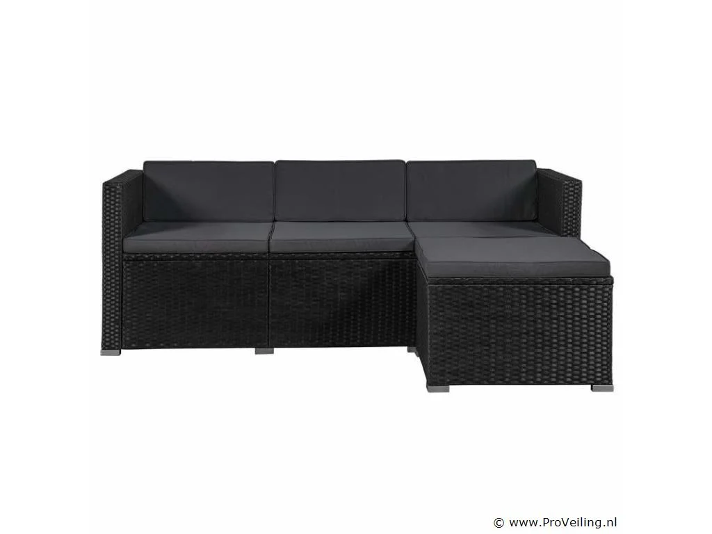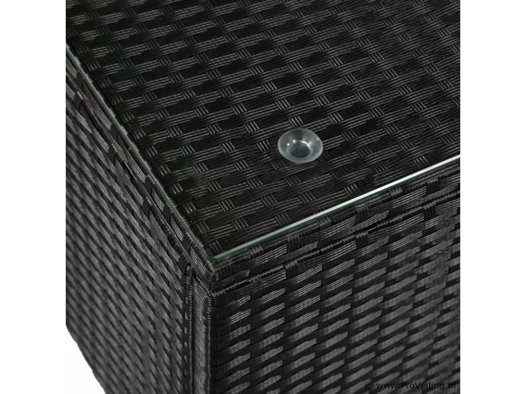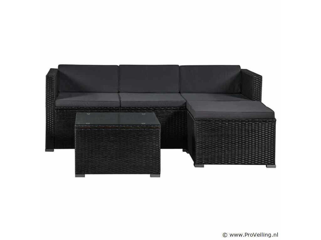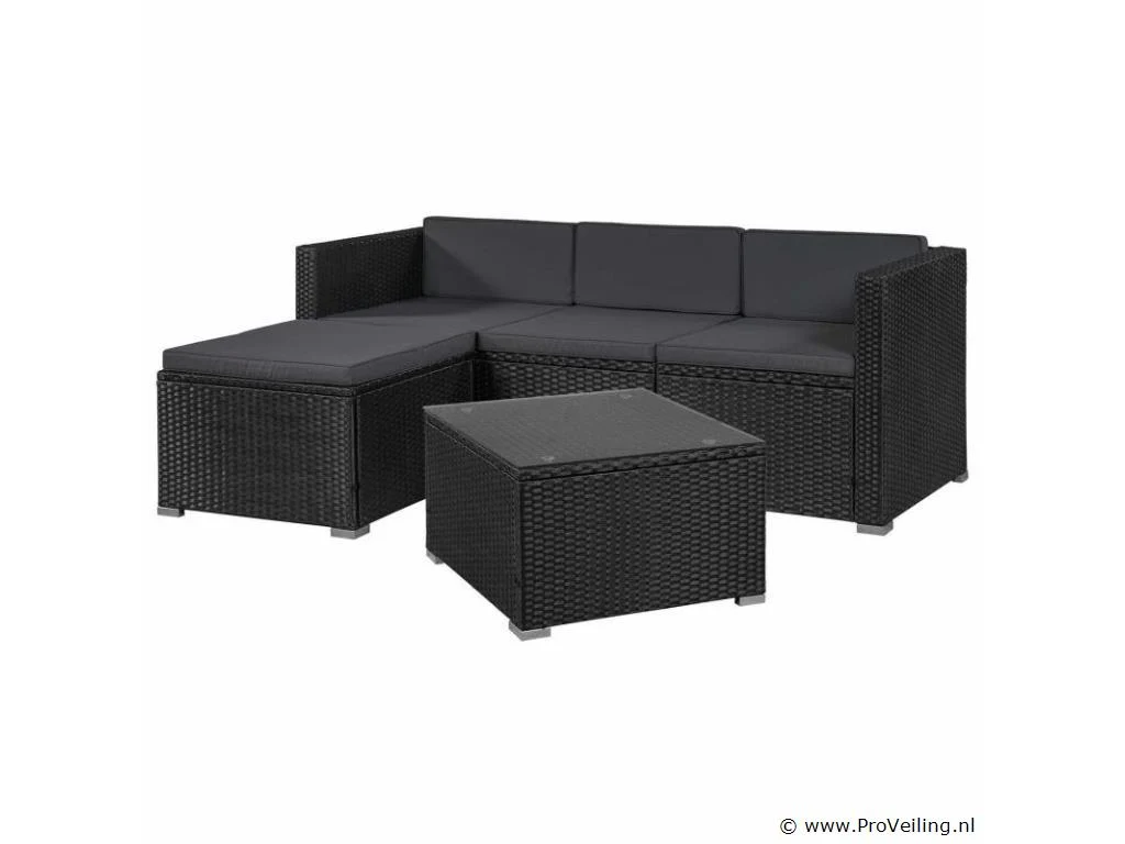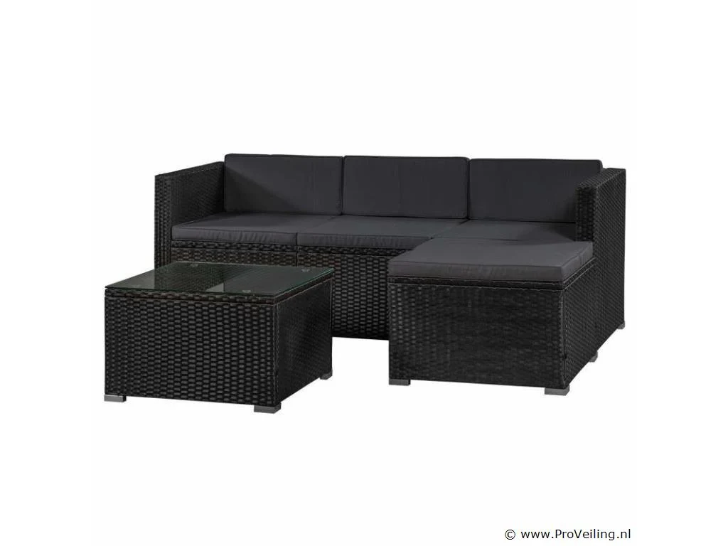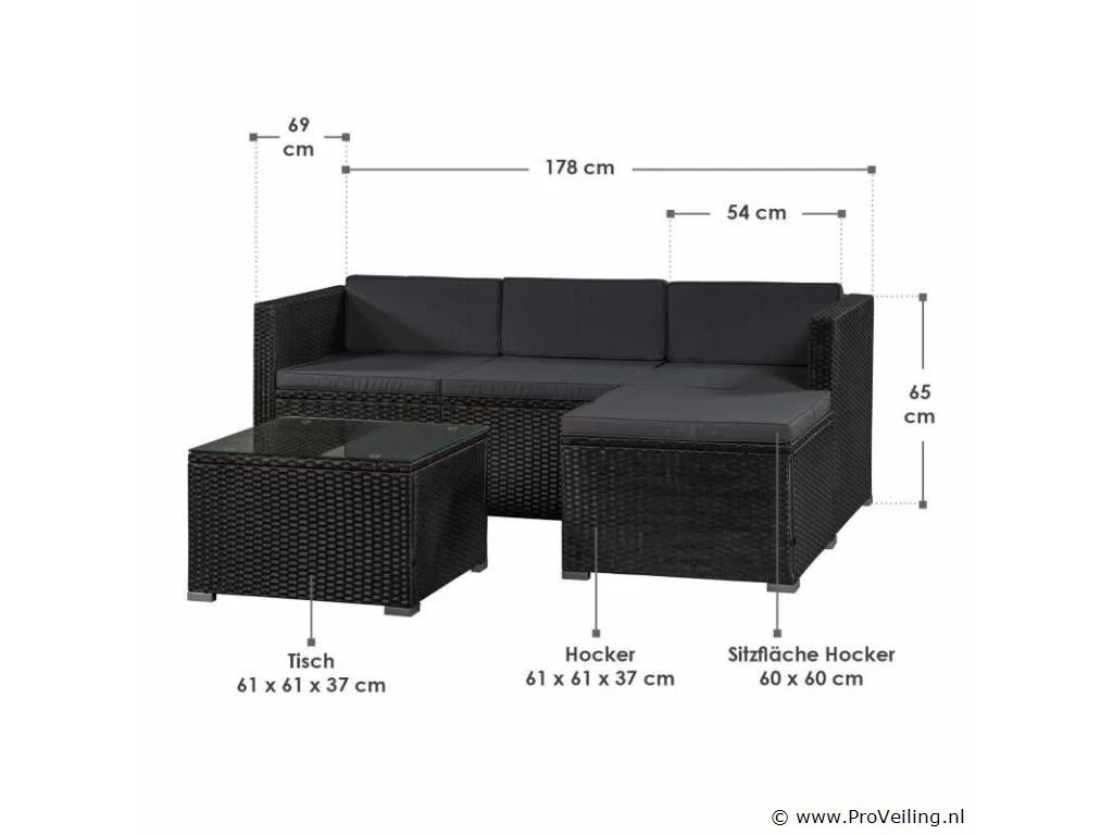 Ben je op zoek naar een comfortabele en grote loungeset voor in je tuin, terras of balkon? Met de zitgroep "Punta Cana M" verander je je buitenruimte in een stijlvolle plek om te ontspannen en je goed te voelen. Gezellige avonden met familie, vrienden of buren worden een geweldige belevenis in de buitenlucht. De unieke rotan-look in zwart met grijze kussens geeft je nieuwe loungemeubel een moderne charme. Creëer je eigen oase van welzijn om te ontspannen en samen te zitten. Technische specificaties: Materiaal: Weefsel: vezels van polyrotan Onderstel: staal Tafelblad: glas Hoezen: schuim, polyester Kleur: Vlecht: zwart Tafelblad: helder Kussenslopen: donkergrijs Afmetingen (ongeveer): Tafel: 61 × 61 × 37 cm (L x B x H) Bank: 178 × 69 × 65 cm (L x B x H) Kruk: 61 × 61 × 37 cm (L x B x H) Dikte zitkussen: 5 cm Dikte glasplaat: 0,5 cm Breedte rugkussen: 54 cm Zitkruk: 60 × 60 cm Leveringsomvang: 1x tafel 1 * Bank 1 x kruk 4 x zitkussens 3 x rugkussens 1 x montagehandleiding