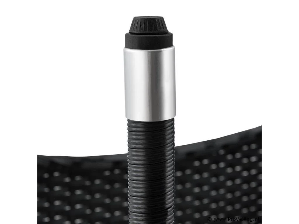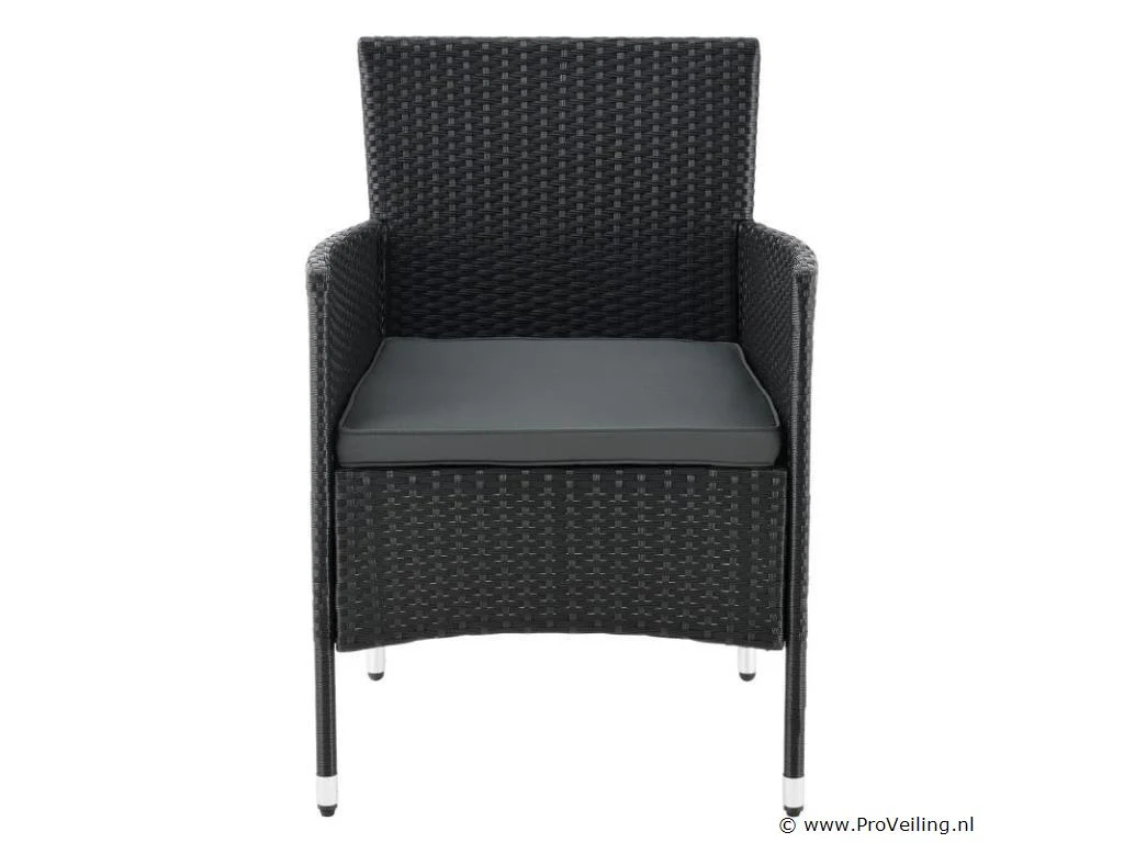 De poly rotan zitgroep Fort Myers (zwart met donkergrijze hoezen) dient als comfortabele lounge voor 4 personen. Met de edele rotan-look verfraait hij elke tuin, terras of balkon. Uitgerust met een rugleuning en kussens, is de tuinset perfect om vele uren door te brengen met familie en vrienden. De 4-delige tuinmeubelset met een stevig metalen frame bestaat uit een 2-zitsbank, twee fauteuils en een kleine bijzettafel met glazen blad. De balkonset is geschikt om gasten in stijl te ontvangen. Zet drankjes en hapjes op tafel en geniet samen van de zomer. Technische specificaties: Materiaal frame: staal, gepoedercoat Materiaal weefsel: polyrotan, gevlochten Materiaal zitkussens: schuim Materiaal hoezen: polyester Materiaal glasplaat: glas (veiligheidsglas) Vlechtkleur: zwart Kleur bekleding: donkergrijs, antraciet Aantal zitplaatsen: Voor 4 personen Stijl, design: moderne rotan-look Afmetingen (ongeveer): Afmetingen tuintafel: 60 × 40 × 35 cm (BxDxH) Afmetingen bank: 86 × 51 × 84 cm (BxDxH) Afmetingen tuinstoelen: 42 × 51 × 84 cm (BxDxH) Hoogte rugleuning vanaf vloer: 84 cm Hoogte armleuning vanaf vloer: 62 cm Zithoogte zonder bekleding: 42 cm Dikte zitkussen: 5 cm Leveringsomvang: 1 x glazen tafel 2 x stoelen 1 x 2-zits zitbank 1 x groot zitkussen 2 x kleine zitkussens 1 x montagehandleiding