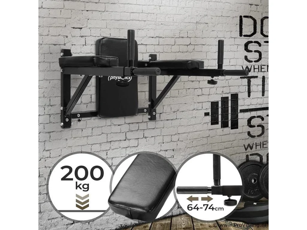Een wasbord in slechts enkele weken zonder geld uit te geven in dure sportscholen - met je persoonlijke dip-station blijft dit geen droom, maar wordt het werkelijkheid! Slechts een paar minuten training per dag is voldoende om je doel te bereiken. Het praktische en ruimtebesparende dip-station kan eenvoudig aan de muur worden bevestigd. Het apparaat is flexibel inzetbaar en kan afwisselend dip-oefeningen en beenheffen worden getraind. Als beenlift kunnen de buikspieren effectief worden getraind, terwijl het gebruik als dip-station de ontwikkeling van borst-, schouder- en tricepsspieren bevordert. Technische informatie: Afmetingen (b x h x d): ca. 68x 47x 64- 74cm Diameter greep: 25 mm. Horizontale greep: 16,5 cm. Verticale handgreep: 13 cm. Vierkante stalen buis: 3,8 x 3,8 cm. Armvulling: 29,5 x 12,5 cm. Rugkussen: 40 x 24 cm. Maximale belasting: ca. 200 kg. Gewicht: ca. 7,2 kg. Materiaal: staal, kunststof, pvc, polywood, schuim. Samenstelling textiel: 100% polyurethaan. Kleur: zwart. Inhoud levering: 1 x dip-station BHTN08 als bouwpakket voor zelfmontage. 1 x meertalige handleiding (DE/EN/ES/FR/IT).