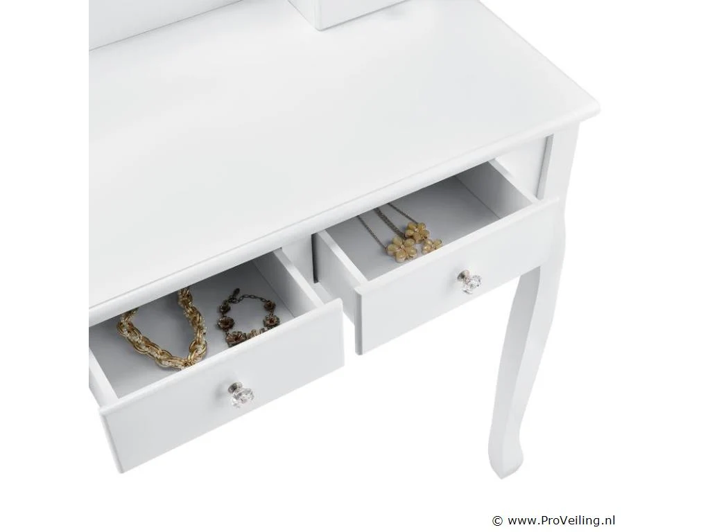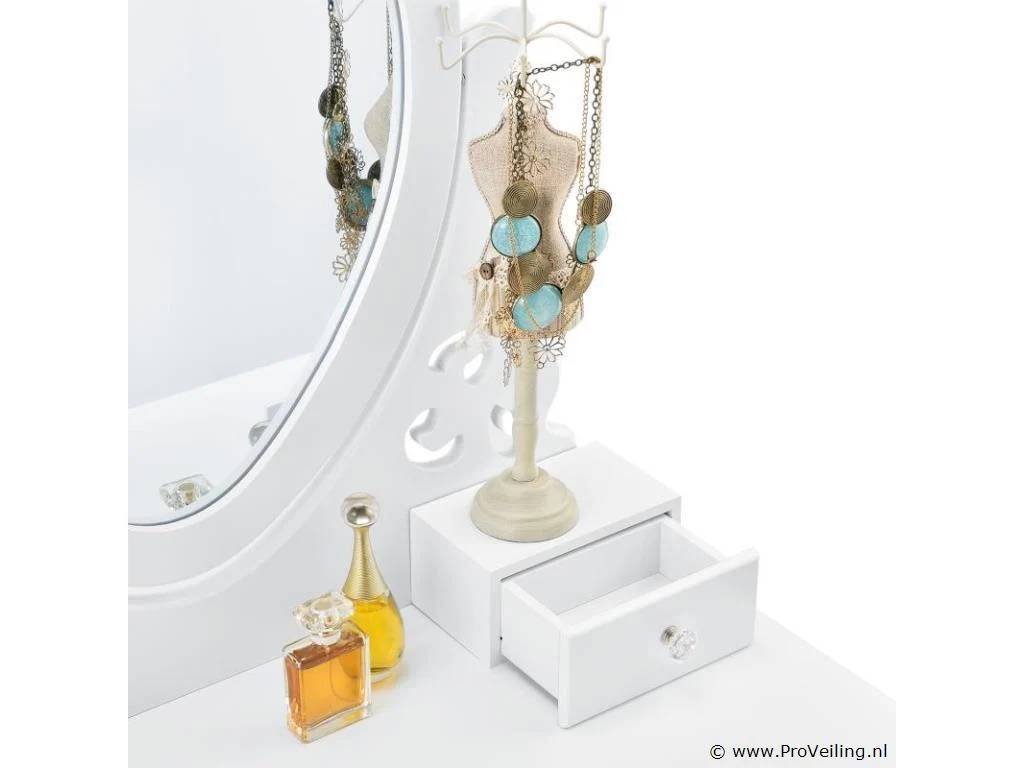 De make-up tafel Julia wit met spiegel, krukje en 4 lades is de absolute musthave voor beauty queens. Ontwerp een comfortabele cosmetica- en kappershoek in de slaapkamer, tienerkamer of kinderkamer. De kaptafel is gemaakt van wit gelakt MDF-hout en maakt indruk met zijn romantische, speelse landelijke uitstraling. De hartvormige spiegel en het krukje met bloemenbekleding zorgen voor veel comfort bij dagelijkse make-up en kappersbeurt. Vier lades met decoratieve handgrepen bieden ruimte voor cosmetica, parfum, sieraden en allerlei accessoires. Technische specificaties: Kaptafel: 100% MDF-hout Kruk: 40% katoen, 60% polyester Kleur wit Ontwerp: landelijke stijl Aantal spiegels: 1 Aantal lades: 4 Maximale belasting kruk: 100 kg Afmetingen (ongeveer): Totale afmetingen: 74 x 40 x 138 cm (BxDxH) Hoogte tafel: 76 cm Hoogte spiegelbevestiging: 62 cm Kruk: 37 x 28 x 45 cm Leveringsomvang: 1 × kaptafel 1 × kruk 1 × montage-instructies