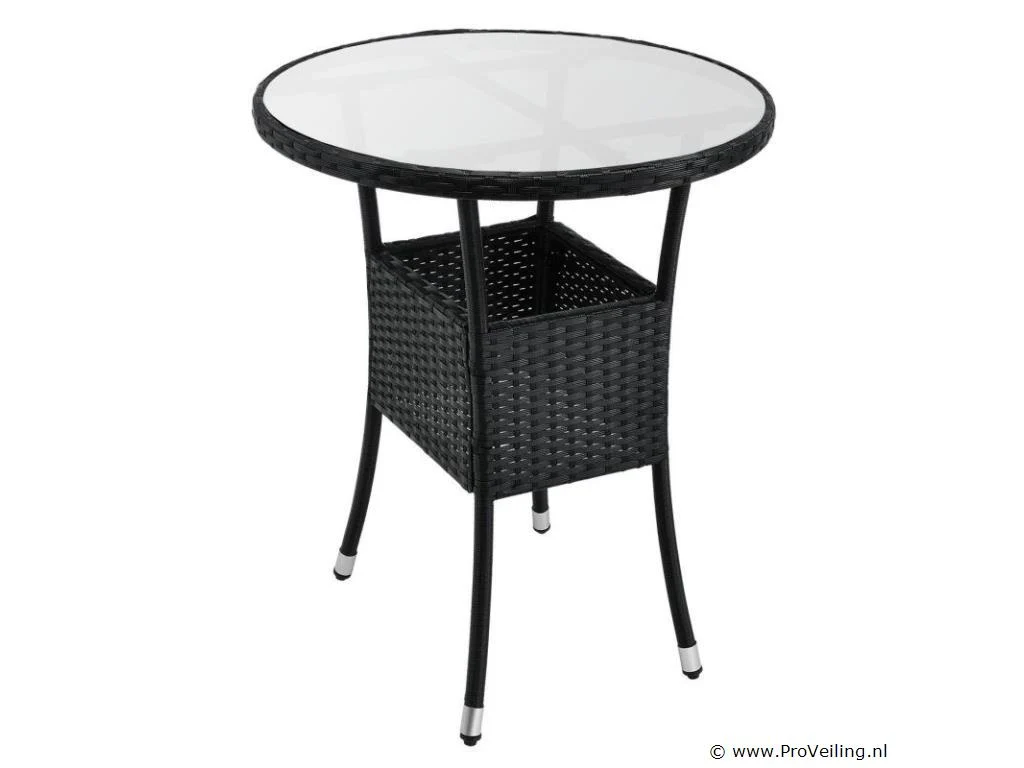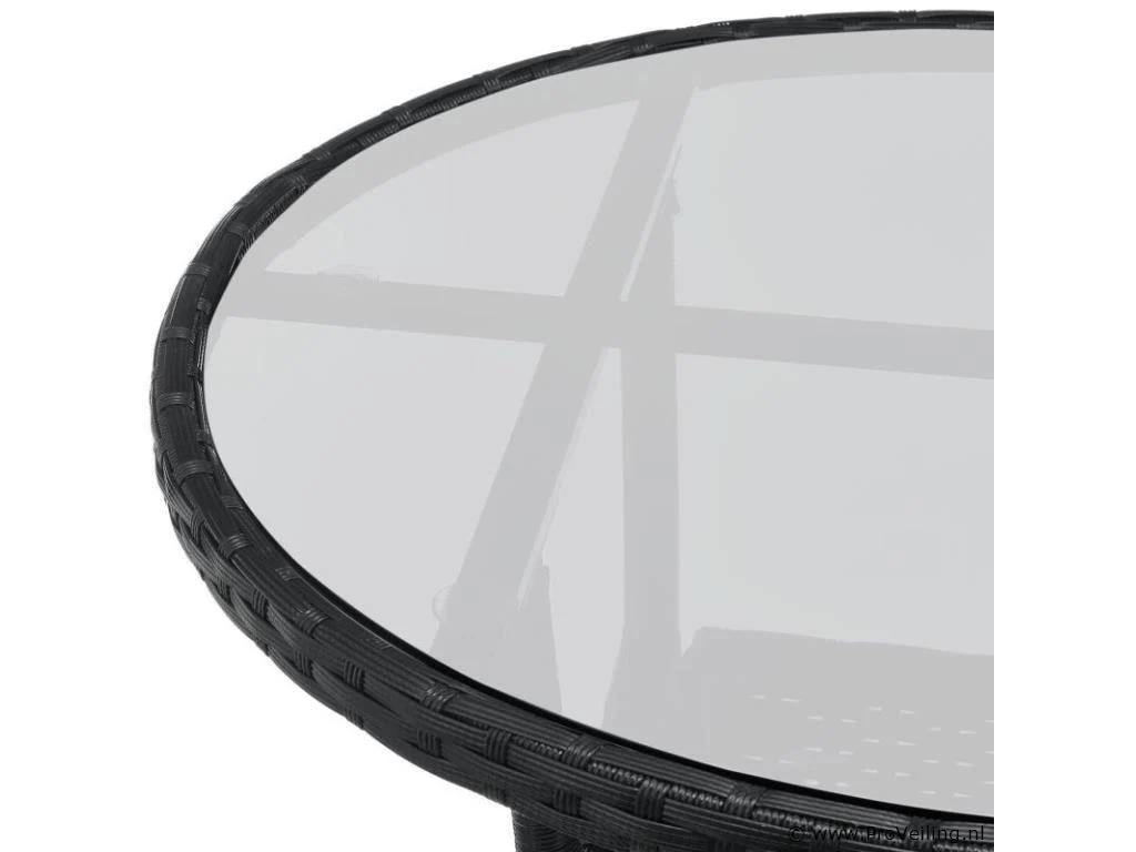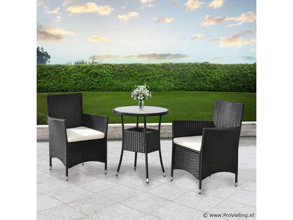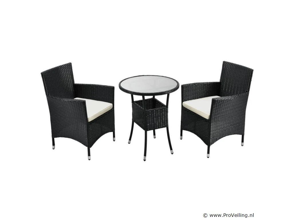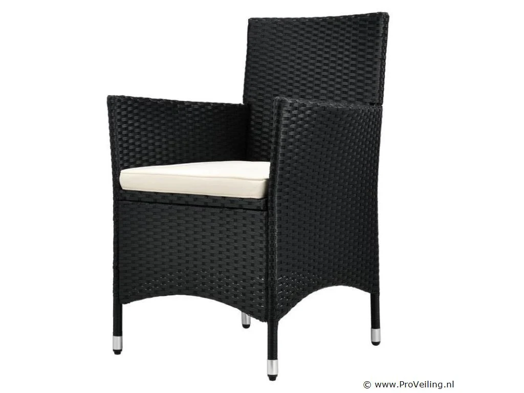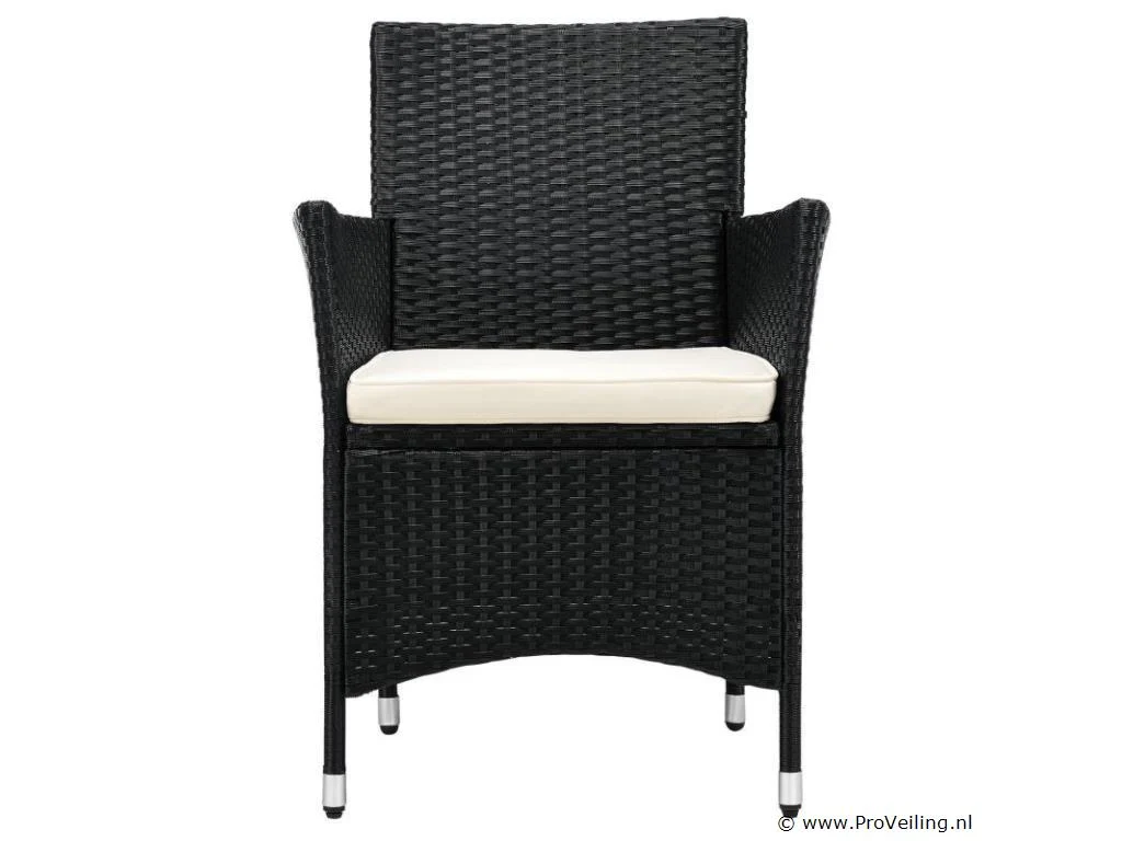 Technische specificaties: Materiaal stoel: polyrotan & metaal Materiaal tafel: polyrotan, metaal & glas Materiaal pads: polyester & schuim Wasbare hoezen: ja Weerbestendig: ja Kleur meubel: zwart Kleur zitkussens: crème Maximaal gewicht: 160 kg Afmetingen (ongeveer): Afmetingen stoel: 58 x 58 x 85 cm (lengte x breedte x hoogte) Stoelzitting: 45 x 45 cm Zithoogte: 41 cm Hoogte tafel: 73 cm Diameter tafel: 60 cm