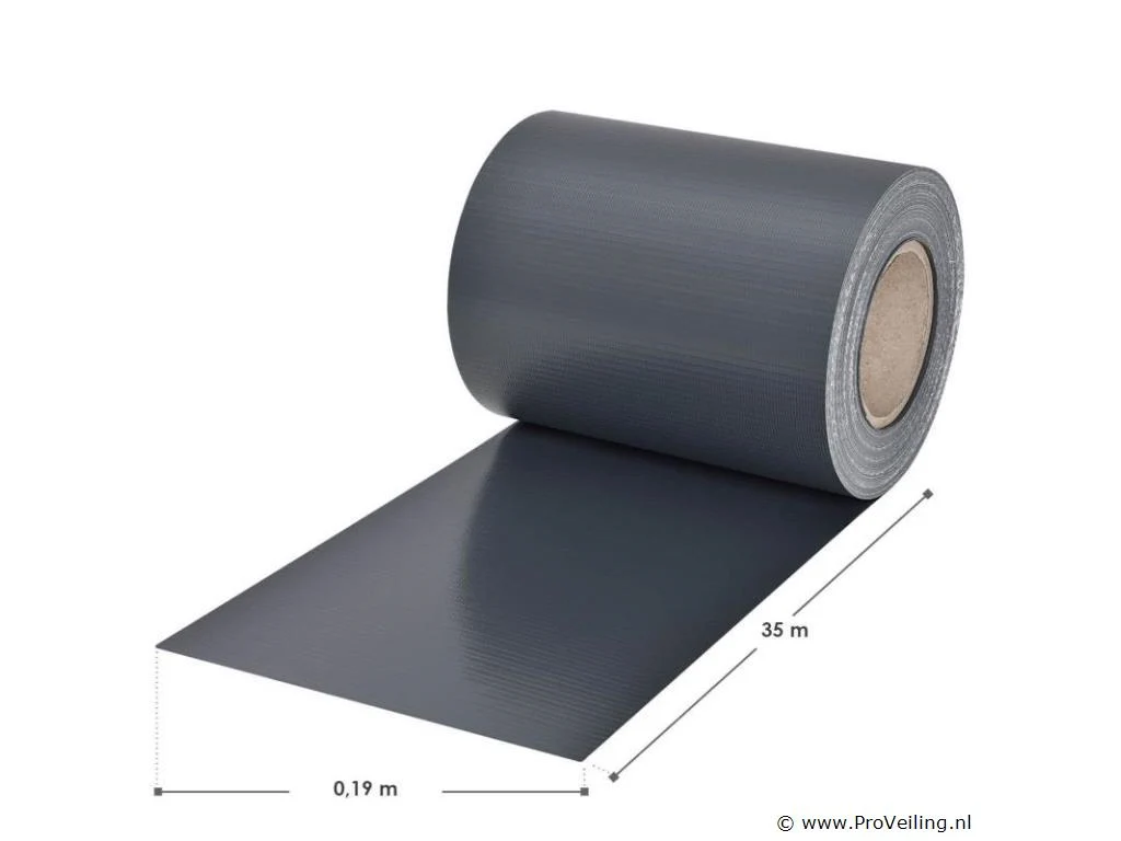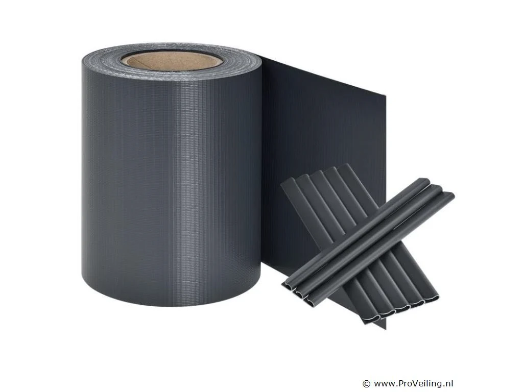 Technische specificaties: Kleur antraciet Aantal montageklemmen: 30 Materiaal: PVC PVC-kwaliteit: 450 g / m Temperatuurbereik: -30 ° C tot +70 ° C UV- en weerbestendig: Ja Afmetingen (ongeveer): Lengte: 35m Hoogte: 19cm