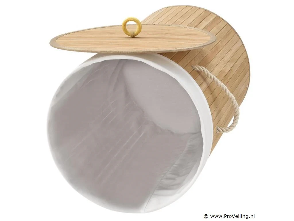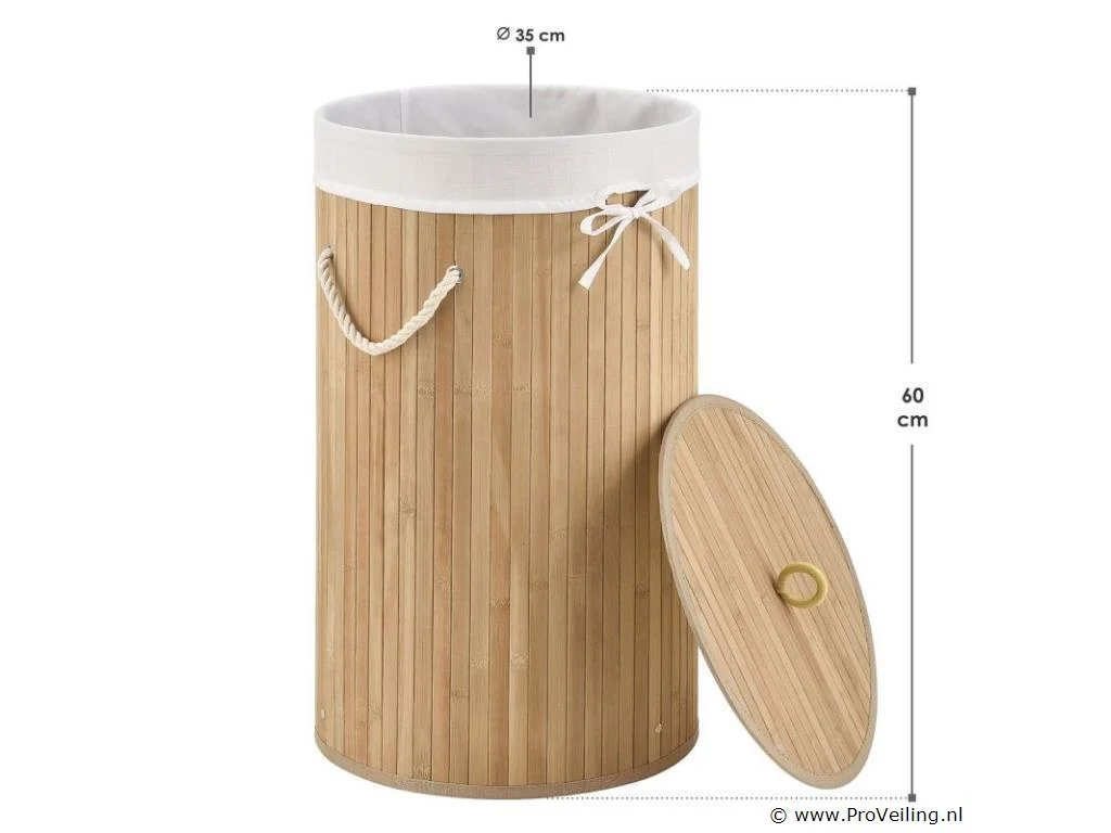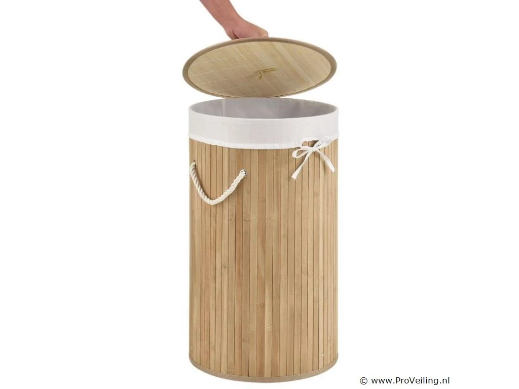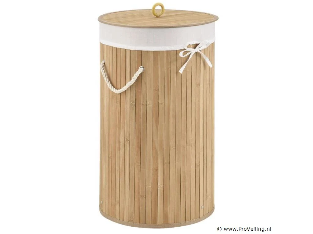Berg vuile was netjes en afgesloten op De ronde bamboe wasmand Curly-Round (55 liter, naturel) met deksel en waszak wordt gebruikt om je wasgoed netjes in op te bergen. Bewaar ruim 50 liter vuile was voor een 2-persoonshuishouden. Voor meer orde plaats je de mand (Ø 35 cm, smal) in de slaapkamer of naast het bad in de badkamer. Voor hygiënische opslag kan de mand worden afgesloten met een houten deksel. Zo blijven nare luchtjes weg! Bij de wasbox hoort ook een uitneembare waszak (polyester). Zodat je de wasmand flexibel naar de wasmachine kunt dragen, is de wasbox licht van gewicht en voorzien van twee draagbeugels. Technische specificaties: Inhoud: 55 liter Materiaal body: bamboe, metaal Lichaamskleur & -vorm: Natuurlijk, rond Materiaal waszak: 100% polyester Kleur waszak: wit Handgrepen: 2 x koorden Plaats van gebruik: Droge binnenruimte Afmetingen (ongeveer): Hoogte: 60cm Diameter: 35cm Leveringsomvang: 1 x wasmand 1 x waszak 1 * Instructie