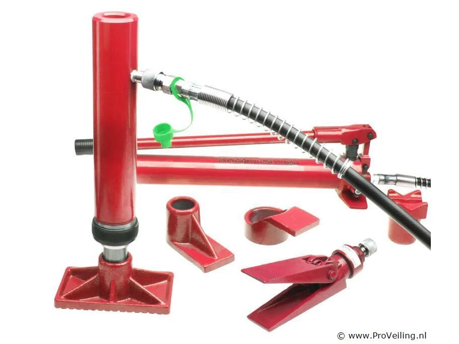 Hydraulische carrosseriepers in stalen kist !!! Inbegrepen in de koffer:Cilinder: 340 mm lang, 140 mm slag 0,5 tot. spreider Aparte hydraulische pomp en aansluitslang Hydraulische leiding 1450 mm Pompstang 450 mm Inhoud: Steunplaat Drukschoen Drukwig Drukstuk cilindrisch Drukbal (rubber) Drukstuk "V"-vorm Adapter 10 ton handpomp Druk cilinder Hydraulische slang Beschermkappen Connectoren Drukkracht: 10 ton Verlenging: 550 mm Verlenging: 350 mm Verlenging: 250 mm Verlenging: 150 mm De deukreparatieset wordt geleverd in een passende blikken doos met een piepschuim inzetstuk (zie foto). Deze maken geen deel uit van deze aanbieding, ze dienen alleen om deze set te vervoeren. In industriële kwaliteit!