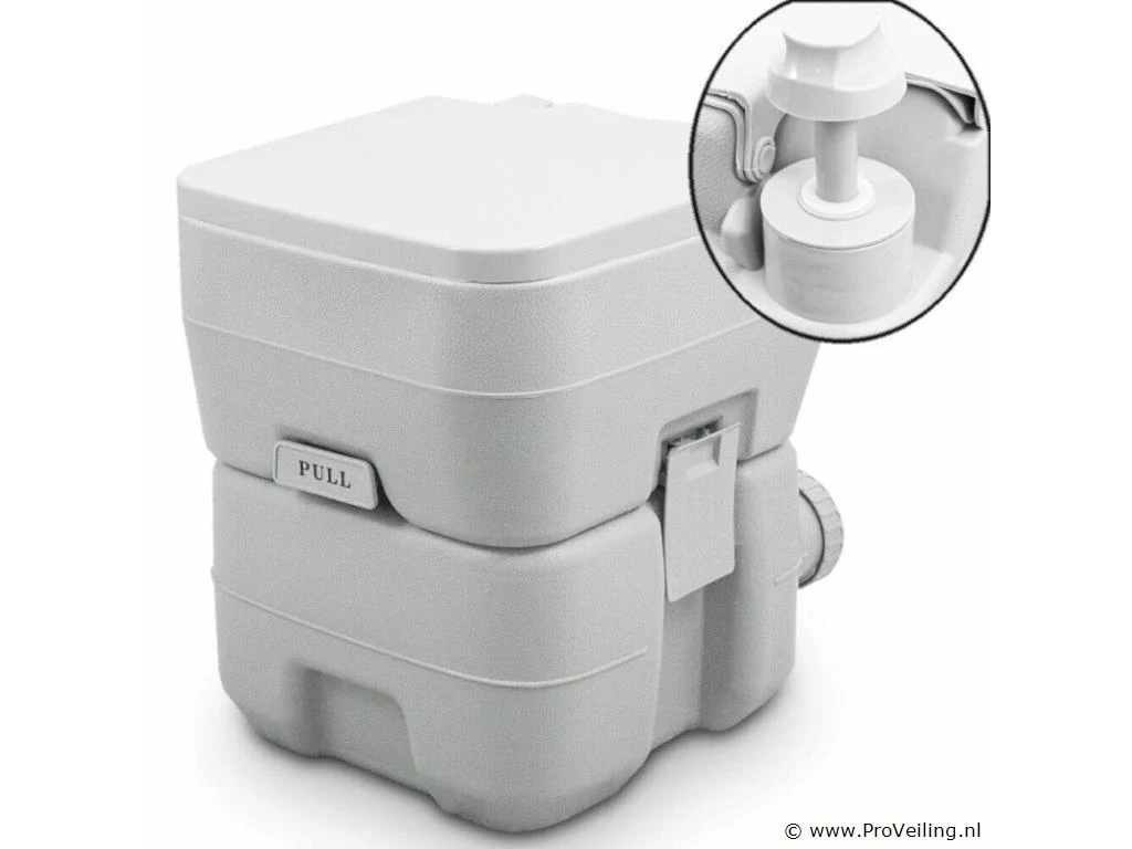 Camping toilet Het praktische, draagbare campingtoilet is de ideale metgezel voor op de camping, in de tuin, in de stacaravan, thuis, op festivals, op vakantie, buitenshuis en onderweg. Hygiënisch en schoon doorspoelen is mogelijk door middel van een plunjerpomp, tevens heeft het toilet een dubbel spoelsysteem. Ook de zithoogte van 415 mm biedt een aangenaam zitcomfort. De vuilwatertank wordt geleegd via een grote afvoeropening. Het toilet heeft een verswatertank van 10L en een vuilwatertank van 20L. Met een gewicht van slechts 5 kg is hij ook erg licht. Het toilet is geïmpregneerd met een plastic afdichting, voor het eerste gebruik eenvoudig met een droge doek afvegen. TECHNISCHE SPECIFICATIES Vuilwatertank: 20L Verswatertank: 10L Afmetingen (H/B/D): 415 x 365 x 420 mm Zithoogte: 415 mm Maximale belasting: 200 kg Maximale belasting: polyethyleen met hoge dichtheid, polypropyleen Kleur: lichtgrijs LEVERINGSOMVANG ? 1x campingtoilet