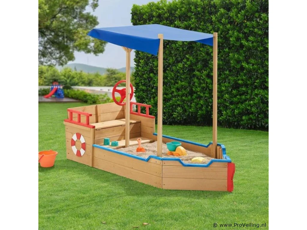 Zandbak Captain Pit met bankje en grondzeil Kinderen houden ervan om creatief te spelen, vooral als ze tegelijkertijd dingen kunnen vormgeven en creëren. Je kunt precies dit fantasierijke spel ondersteunen met onze sandbox Captain Pit. Het creatieve piratendesign laat de harten van kinderen tot bloei komen en brengt de kinderspeelplaats in de eigen tuin. De kleintjes kunnen graven, vormen en bouwen zoals hun hartje begeert. Tegelijkertijd bevordert u spelenderwijs zijn motoriek. Coördinatie en bereidheid om te experimenteren worden in het vrije spel versterkt en je kind kan met vertrouwen de wereld ontdekken. Geïntegreerde bank In de speelse zandbak zijn extra zitjes verwerkt. Deze zijn populair bij kinderen en bieden extra comfort en speelmogelijkheden. De lengte van bijna twee meter en 94 cm breedte biedt voldoende ruimte om te spetteren en te spelen met andere kinderen. Massief natuurlijk hout Het massieve grenenhout biedt een hoge mate van sterkte en veerkracht. Het werken met natuurlijke materialen zoals hout en zand en het aanraken van verschillende oppervlakken prikkelt de zintuigen van je kind en bevordert de ontwikkeling. Technische specificaties: Materiaal zandbak: grenenhout Materiaal vlag: zijden stof Materiaal stuur: kunststof Materiaal mast: kunststof Kleur: naturel Leeftijdsbeperking: 3 – 10 jaar Grondzeil: aanwezig Afmetingen (ongeveer): Afmetingen (L x B x H): 195 x 94 x 136 cm Hoogte boot zonder mast: 48 cm Hoogte boot met mast: 136 cm Vulhoogte zand: 12 cm Leveringsomvang: 1x Zandbak Captain Pit 1 * Instructie