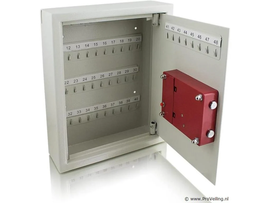 De sleutelkluis is ideaal voor het opbergen van belangrijke sleutels. Kies tussen veilige wand- of kastmontage. De sleutelkluis kan alleen worden geopend door het invoeren van uw persoonlijke pincode of met de meegeleverde veiligheidssleutel. Inrichting: Sleutelkluis voor wand- of kastmontage 48 sleutelhaken Gleuf voor sleutels elektronisch cijferslot Deur met dubbele grendelvergrendeling Inclusief 2 sleutels Technische specificaties: Afmetingen: 300 mm x 365 mm x 100 mm (B/H/D) Interne afmetingen: 295 mm x 360 mm x 80 mm (B/H/D) Stalen wanddikte: 2 mm Stalen deurdikte: 3 mm Slotbehuizing: polypropyleen Bout: staal, ø15mm Kleur: lichtgrijs Gewicht: 6,8 kg Leveringsomvang: 1x sleutelkluis incl. elektronisch cijferslot 2x beveiligingssleutels 2x bevestigingsbouten 1x gebruiksaanwijzing
