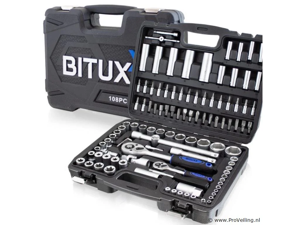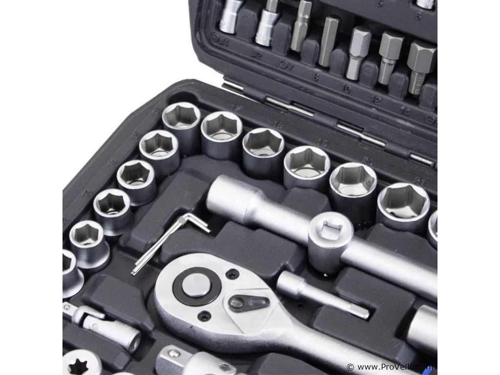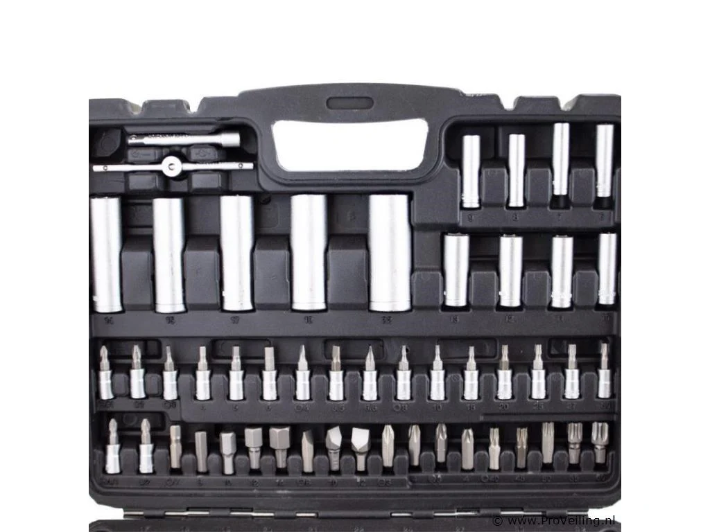 Deze 108-delige dopsleutelset overtuigt door kwaliteit en omvang. De ideale set voor de ambitieuze doe-het-zelver, praktisch en overzichtelijk, veilig opgeborgen in de koffer. Het gereedschap is gemaakt van chroom-vanadium-staal, het vanadium zorgt voor een verhoogde taaiheid met een fijnere structuur en het chroomgehalte verbetert de corrosiebescherming en hardbaarheid. Technische specificaties: Materiaal kast: kunststof Gereedschapsmateriaal: chroom-vanadiumstaal Leveringsomvang: 17x 1/2" doppen: 10, 11, 12, 13, 14, 15, 16, 17, 18, 19. 20, 21, 22, 24, 27, 30 32 mm 8x 1/2" Torx doppen: EI0, ??11, 12, 14, 16, 18, 20, 24mm 5x 1/2" extra diepe doppen: 14, 15, 17, 19, 22 mm 2x 1/2" bougiedoppen: 16 mm & 21 mm 2x 1/2" verlengstangen: 5" & 10" 18x 1/4" doppen: SL4, 5.5, 6.5, PH, 2 PZ1, 2e HEX3, 4, 5, 6, T8, 10, 15, 20, 25, 27, 30 13x 1/4" doppen: 4, 4,5, 5, 5,5, 6, 7, 8, 9, 10, 11, 12, 13, 14 mm 8x 1/4" extra diepe doppen: 6, 7, 8, 9, 10, 11, 12, 13mm 5x 1/4" Torx doppen: E4, 5, 6, 7, 8 2x 1/4" verlengstukken: 2" & 4" 1x 1/4" T-greep 1x 1/4" insteekgreep 6" 2x ratel: 1/4" & 1/2" 2x cardangewrichten: 1/4" & 1/2" 1x driedubbele adapter 17x bits SL8, 10, 12 T40, 45, 50, 55, 60 PH3, 4 Pz3, 4 HEX7, 8, 10, 12, 14 3x inbussleutels: 1,5, 2, 2,5 mm 1x bithouder 1x kunststof koffer