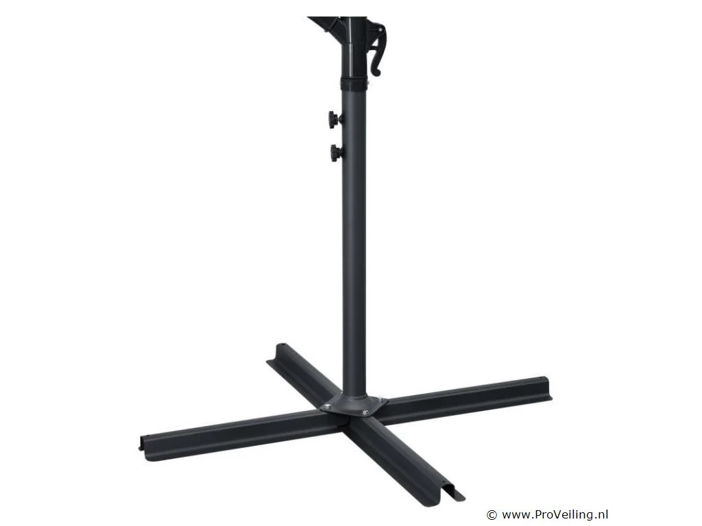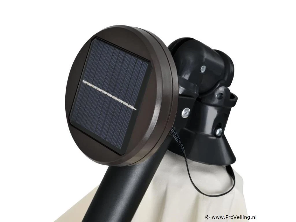 De trendy zweefparasol Brazil met led-verlichting, zwengel en voet in grijs/crème is de perfecte aanvulling op balkon, terras, zwembad of tuin. Met zijn parasol van 350 cm beschermt de parasol je tegen de brandende zon en gedeeltelijk tegen UV-straling. Zit koel in de schaduw. Dankzij de aan de zijkant gemonteerde arm kan de ruimte onder de parasol optimaal worden benut. Daarnaast is de marktparaplu traploos kantelbaar, waardoor je de paraplu eenvoudig met een hendel aan de stand van de zon kunt aanpassen. In het donker zorgt de 24 LED-verlichting voor een sfeervolle ambiance. Zo kunt u heerlijk ontspannen en genieten van het mooie zomerweer in de tuin. Technische specificaties: Materiaal: polyester (160g/m²), staal (gepoedercoat) Kleur: grijs met creme wit Aantal daksteunen: 6 Bediening: slinger Helling: Traploos verstelbaar, eenzijdig aan de mast Aantal LED's: 24 lampen Vermogen LED-verlichting: 0,7 watt Afmetingen (ongeveer): Diameter kap: 330 cm Hoogte gesloten: 250 cm Hoogte uitgeklapt: 245 cm Stahoogte: 196 cm Ø parasolstok: 42 mm Ø standpijp: 48 mm Afmeting voet: 100 x 100 cm Afmeting paraplu: 350 cm Leveringsomvang: 1 x vrijhangende parasol met voet 1 x zonnepaneel met batterij