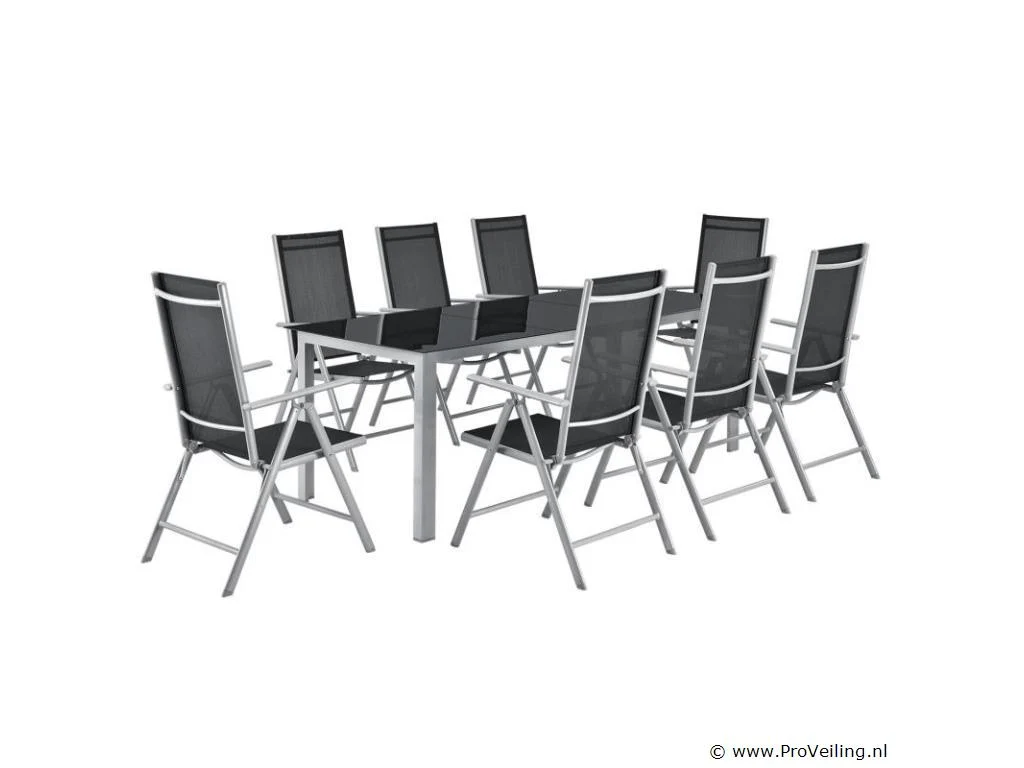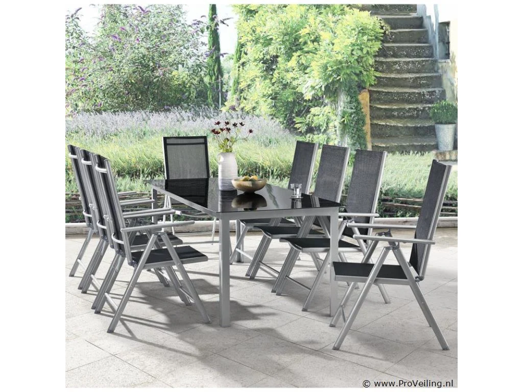 De 9-delige aluminium tuinset Milano met een grote tafel en acht stoelen is een perfecte zomerse metgezel voor frisse lucht kenners. Breng spelavonden, brunch- en koffiekransen, kleurrijke kinderverjaardagsfeestjes en grote barbecuefeesten door bij je nieuwe eetgezelschap. De montage is snel gedaan en de lichte tuinmeubelen zijn in een mum van tijd mee te nemen. De supergemakkelijke reiniging en verzorging duurt niet lang na elk feest. Vouw je stoelen in één keer op en alle sporen zijn verdwenen. Technische specificaties: Materiaal frame: gepoedercoat aluminium Materiaal gaas: textielstof Materiaal tafelbladen: 5 mm veiligheidsglas Kleur montuur: zilvergrijs Vlechtkleur: zwart Afmetingen (ongeveer): Afmetingen tafel: 190 x 90 x 75 cm Afmeting stoel: 52 x 65 x 110 cm Zitting: 44 x 44 cm Ruggedeelte: 65 x 44 cm Leveringsomvang: 1 × tafel 8 × stoel 3 × glasplaat 1 × montage-instructies