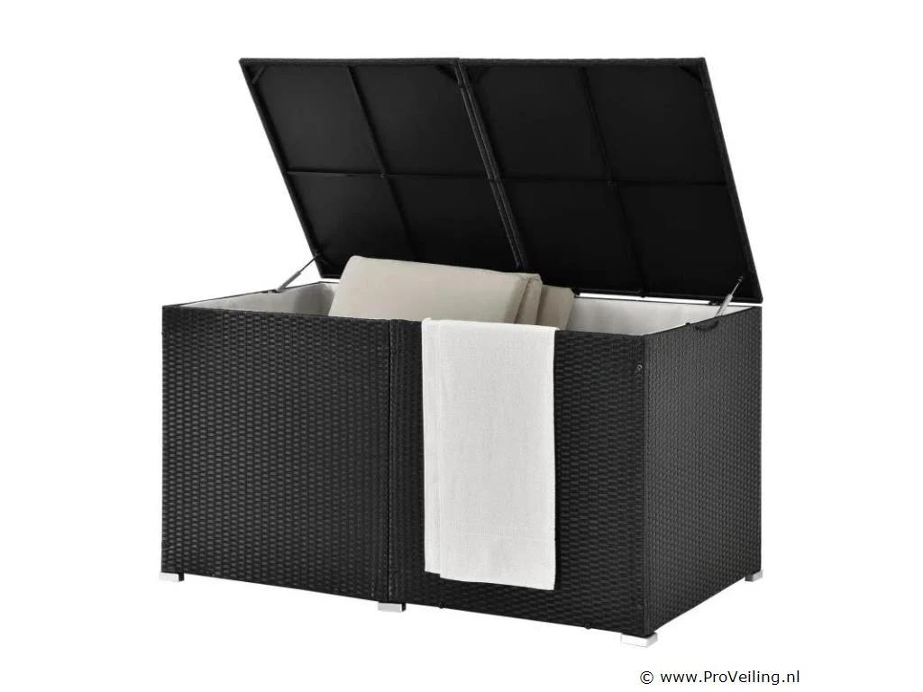 De polyrotan tuinmeubelbox Ikaria (950 L inhoud, zwart) biedt de perfecte opbergruimte voor je tuinspullen. Berg kussens, kussens of kinderspeelgoed netjes op in de tuinbox. Daar zijn de uitgaven optimaal beschermd. Het binnenzeil zorgt voor extra bescherming en het deksel houdt de box gesloten. Een automatisch hefmechanisme op het deksel maakt veilig sluiten mogelijk. De opbergbox is een echte eye-catcher. Of het nu buiten op het terras, het balkon, in de tuin of binnen in de serre is. De kast van polyrotan overtuigt door zijn moderne en stabiele stijl. Technische specificaties: Materiaal opbergdoos: polyrotan, staal Materiaal binnenzeil: polyester Kleur opbergdoos: zwart Kleur binnenzeil: wit Inhoud: 950 liter Vorm: Rechthoekig Deksel: versterkt, automatisch optillen Plaats van gebruik: binnen & buiten Poten: hoekvoet (4x), zijpoot (2x) Afmetingen (ongeveer): Lengte: 145cm Breedte: 82,5 cm Hoogte: 79,5 cm Leveringsomvang: 1 x paddoos 1 x binnenzeil 1 x Instructie Je ontvangt het product goed verpakt als bouwpakket voor zelfmontage per pakketdienst. De padbox is niet waterdicht. Plaats de box alleen op een weerbestendige of droge plaats.
