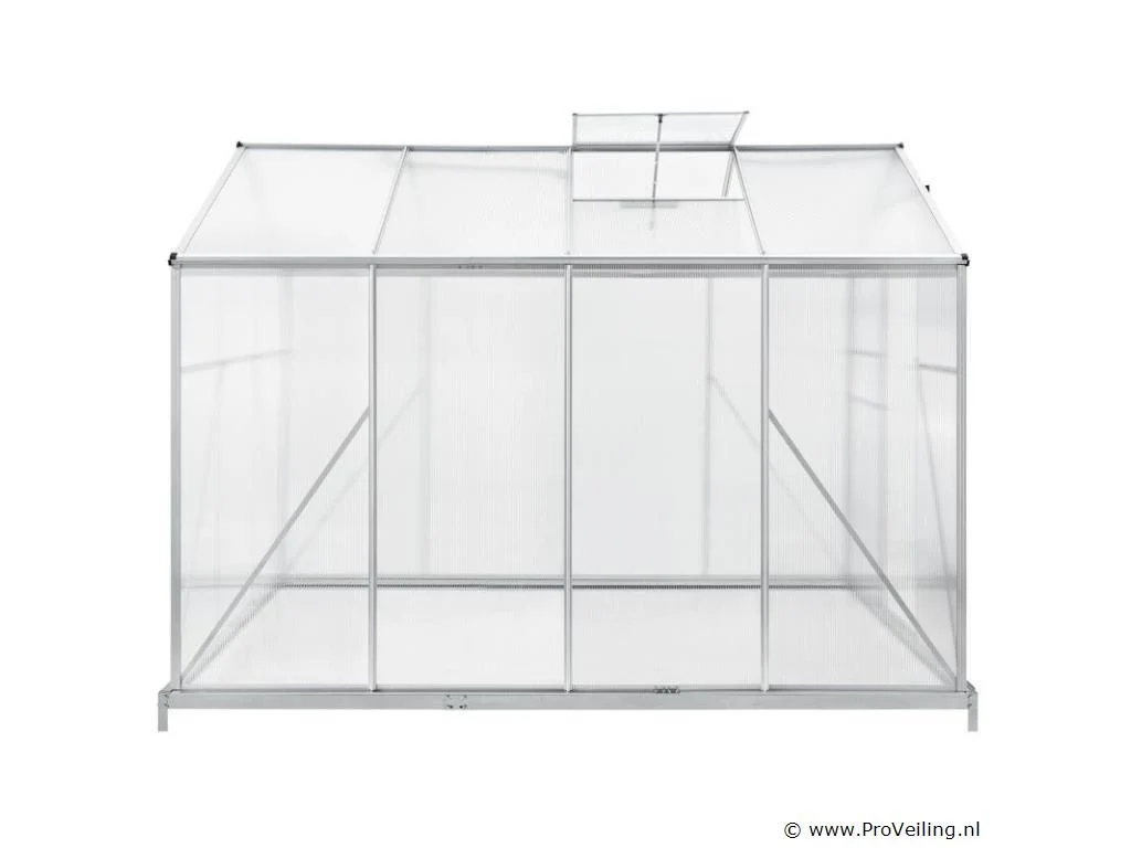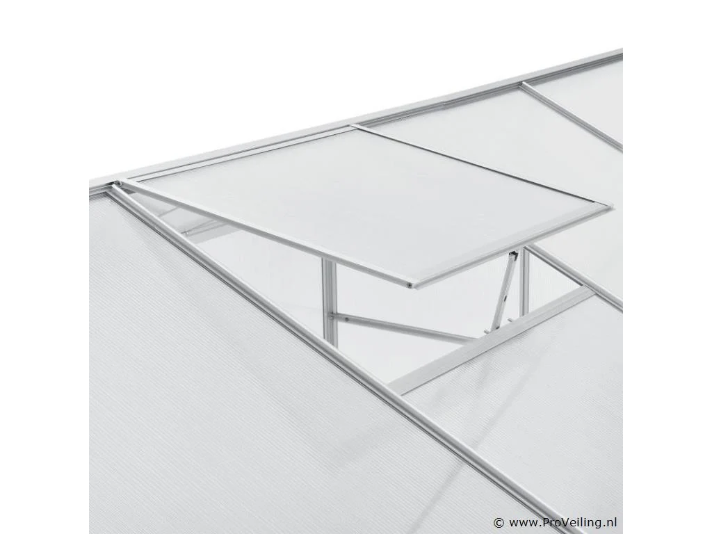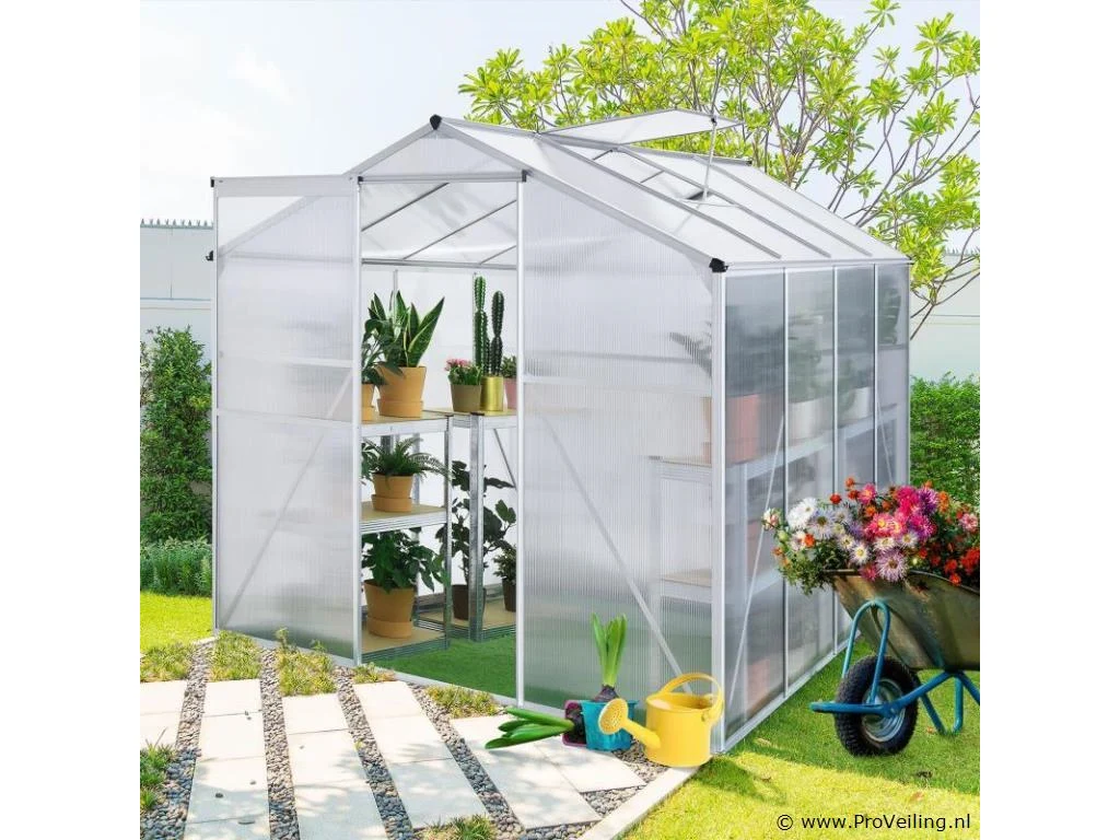 Heb je altijd al je eigen groente- of kruidenbed in je tuin willen creëren voor het kweken van tomaten, komkommers, kruiden of bloemen? Dan is deze aluminium serre met fundering en lichtkoepel de juiste keuze! De kas van 190 × 253 cm is te gebruiken als koelkas, tomatenhuis, plantenhuis of tuinhuisje. Met een vloeroppervlak van 4,75 m² biedt hij ook voldoende ruimte voor het kweken van groenten en fruit en voor het overwinteren van planten. Ideaal voor gepassioneerde hobbytuiniers. Technische specificaties: Materiaal broeikas: aluminium, polycarbonaat Materiaal fundering: staal, verzinkt Kleur lijst: zilver Kleur dubbelwandige platen: transparant Dikte van hollekamerbaanplaten: 4 mm Vloeroppervlakte: 4,75 m² Deur: 1 schuifdeur Ramen: 1 dakraam Kas: gegevensblad om te downloaden Afmetingen (ongeveer): Voetafdruk: 190 × 253 Paginahoogte: 149 Nokhoogte: 195 Voetenfundament: 7 Afmeting deur: 62 × 164 Afmeting raam: 51 x 59 Leveringsomvang: 1 × broeikas 1 × montage-instructies