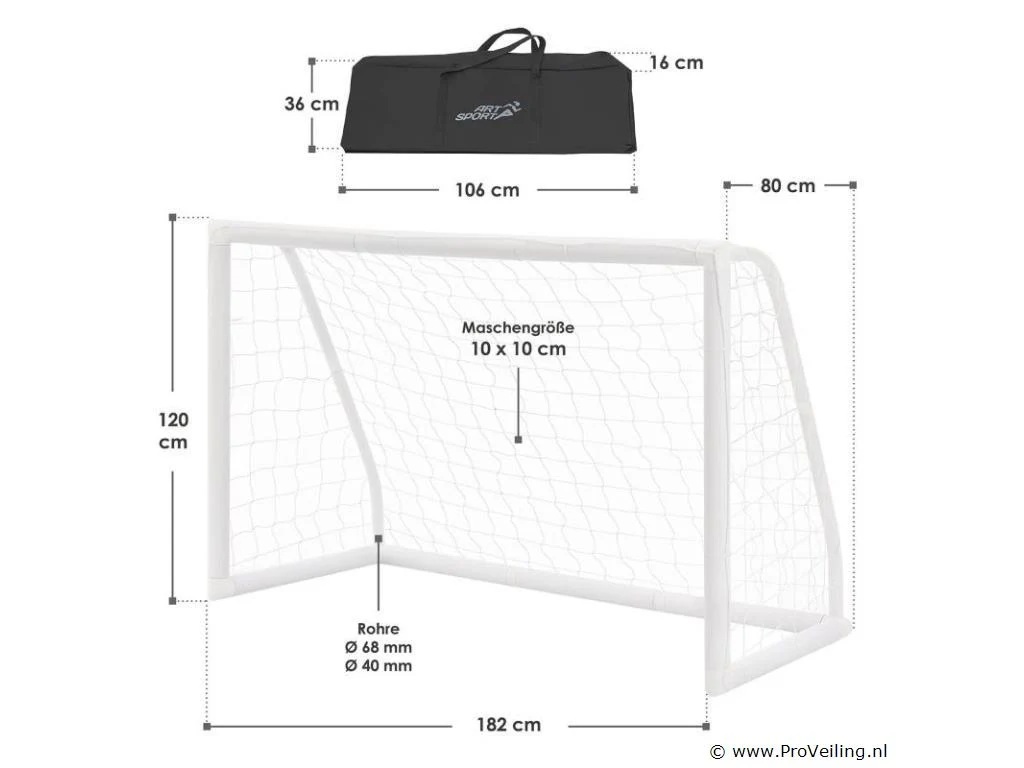 Doelpunten scoren als een pro in je eigen tuin - deze droom wordt mogelijk gemaakt door de 180 x 120 cm voetbalgoal met een praktisch kliksysteem. Gemaakt van hoogwaardig hard PVC, is het doelframe robuust tegen lat- en paalklappen en bovendien verrassend licht. De meegeleverde grondankers zorgen voor een veilige stand, zelfs bij harde stoten of wind. Door het ingenieuze insteeksysteem kan het doel snel worden gemonteerd en gedemonteerd. Dankzij de praktische draagtas vervoer je de set met slechts één hand. Het robuuste net van weerbestendig polyurethaan zorgt voor de professionele uitstraling. Technische specificaties: Materiaal frame: polyvinylchloride (hard PVC) Netmateriaal: polyurethaan Materiaal grondanker: staal (verzinkt) Materiaal draagtas: 600D nylon Kleur poort: wit Netkleur: wit Kleur draagtas: zwart Afmetingen (ongeveer): Totale afmetingen: 182 x 80 x 120 cm (BxDxH) Diameter buizen: Ø 68 mm; Ø 40mm Maaswijdte net: 10 x 10 cm Afmetingen draagtas: 106 x 16 x 36 cm (BxDxH) Leveringsomvang: 1 × doel 1 × gaas 1 × draagtas 4 x grondankers 18 x Kabelbinders 1 × montage-instructies