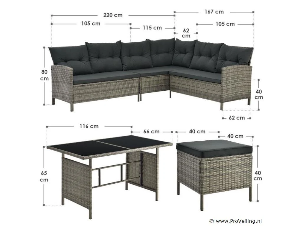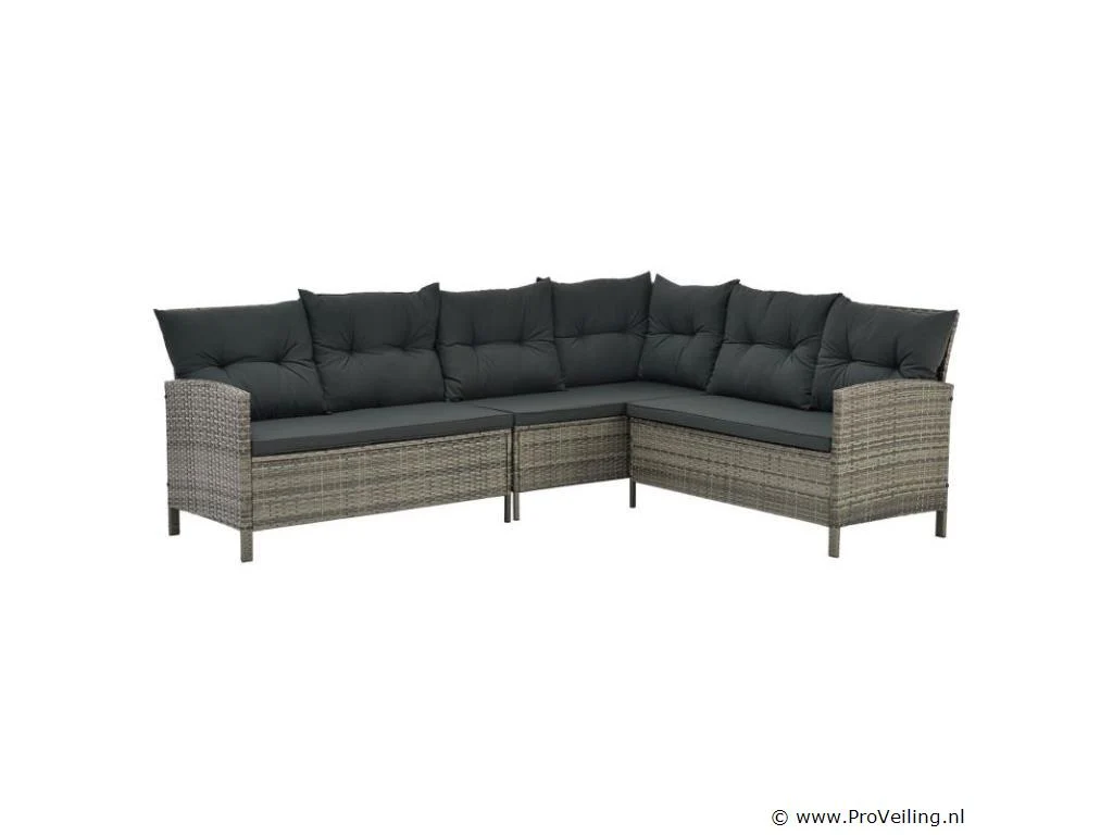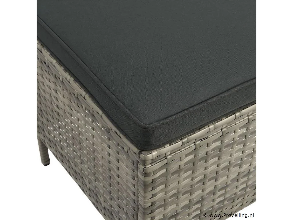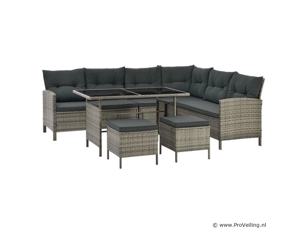 Met de Manacor polyrattan loungeset verander je je tuin, terras of balkon in een stijlvolle plek om te relaxen en je goed te voelen. De grote tuinlounge met een bank, 2 krukken en een tafel is geschikt voor maximaal 7 personen. Zachte zit- en rugkussens zorgen voor een comfortabele zitervaring. De grote eettafel is beschikbaar om te dineren of bordspellen. Gezellige avonden met familie, vrienden of buren worden een geweldige belevenis in de buitenlucht. De unieke rotan-look geeft de tuinmeubelset een moderne charme. Technische specificaties: Materiaal frame: staal, gepoedercoat Materiaal gaas: polyrotan Materiaal tafelblad: veiligheidsglas Materiaal zitkussen: 100% schuim Materiaal hoezen: 100% polyester Vlechtkleur: grijs gemêleerd Kleur hoezen: donkergrijs Dikte glasplaten: 5 mm Aantal zitkussens: 5 Aantal rugkussens: 7 Dikte kussen: 5 cm Omslagen: 180g/m2 Afmetingen (ongeveer): Bankelement links: 105 x 62 x 80 cm Rechter bankelement: 105 x 62 x 80 cm Centraal bankelement: 115 x 62 x 80 cm Kruk: 40 x 40 x 40 cm Zithoogte kruk & bank: 40 cm Tafel: 116 x 66 x 65 cm Een mededeling: De hoezen van de zitkussens kunnen eraf geritst en gewassen worden. De hoezen van de rugkussens zijn echter niet afneembaar (hoes aan het kussen genaaid) en dus niet wasbaar. Ze hebben een ritssluiting, maar die heeft geen functie. Alleen de hoezen van het zitkussen zijn wasbaar. Ververs de impregnering na het wassen. Het hele kussen mag niet in de wasmachine, anders zal de vulling eronder lijden. Leveringsomvang: 1 × hoekbank 2 × krukken 1 × tafel 2 × glasplaten 5 × zitkussens 7 × rugkussens 1 × Instructie