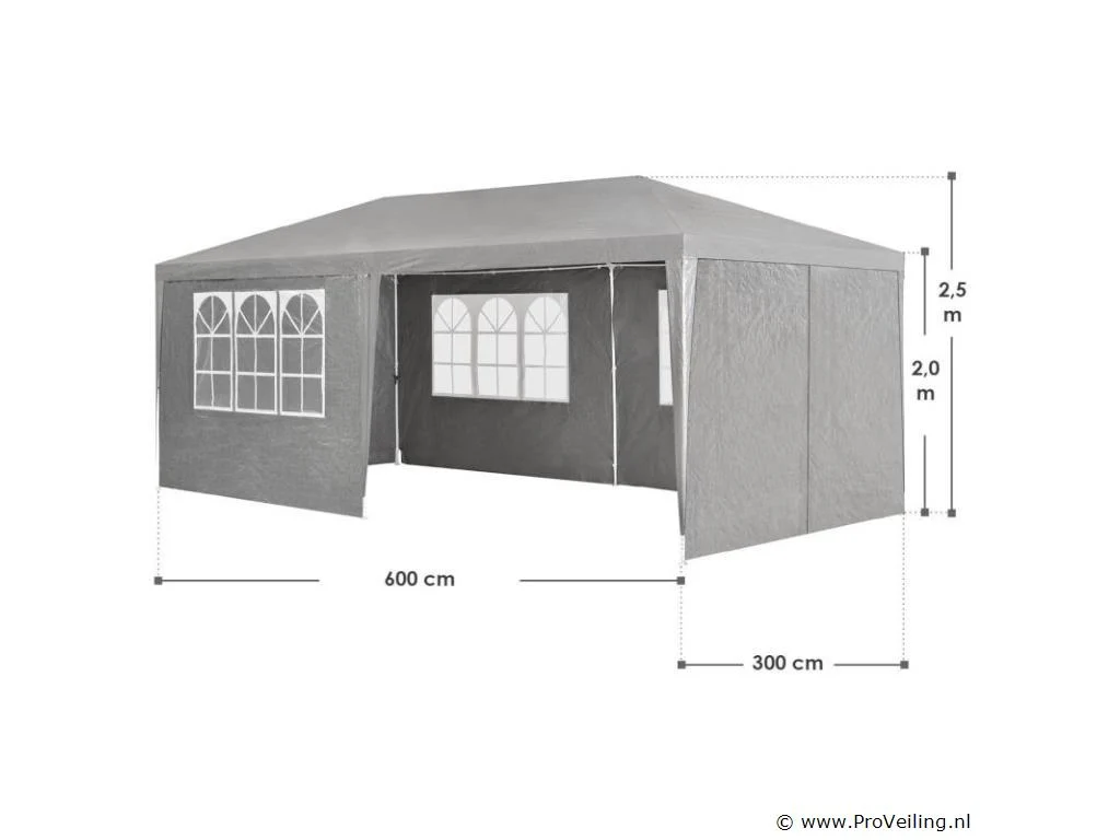 De partytent van 3 x 6 m (grijs) is de perfecte zonwering voor alle soorten buitenevenementen Of het nu gaat om een ??barbecue, een verjaardag of een bruiloft - het praktische paviljoen nodigt uit om samen te zitten en feest te vieren met familie en vrienden. Onder de feesttent zijn u en uw gasten goed beschermd tegen de brandende zon. 's Avonds dienen de uitneembare zijpanelen als extra bescherming tegen koele tocht en muggen. Optimale voorwaarden om speciale gelegenheden uitgebreid te vieren in eigen tuin of op het terras. Technische specificaties: Materiaal frame: staal, gepoedercoat (100%) Materiaal dak: 100 g/m² polyethyleen (100%) Materiaal zijdelen: 90 g/m² polyethyleen (100%) Kleur tuintent: grijs Zijwand met raam: 4 Zijpaneel met ritssluiting: 2 Aantal voeten: 6 Aantal bevestigingstouwen: 6 Aantal grondpennen: 12 Afmetingen (ongeveer): Breedte: 300cm Diepte: 600 cm Hoogte: 250cm Paaldak: Ø 1,8 cm Plaatbodem: Ø 2,4 cm Leveringsomvang: 1 × feesttent 1 × montage-instructies tips: LET OP: Het tuinpaviljoen biedt onvoldoende bescherming bij storm of slecht weer. Niet gebruiken tijdens onweer, sterke windstoten, zware regenval of hagel. Het paviljoen is niet ontworpen voor dit weertype. Alleen geschikt voor privégebruik. Zet de partytent veilig op een vlakke, droge en stevige ondergrond. Houd de minimale afstand van 3 m tot de volgende tent aan. Het is niet mogelijk om 2 tenten aan elkaar te koppelen.